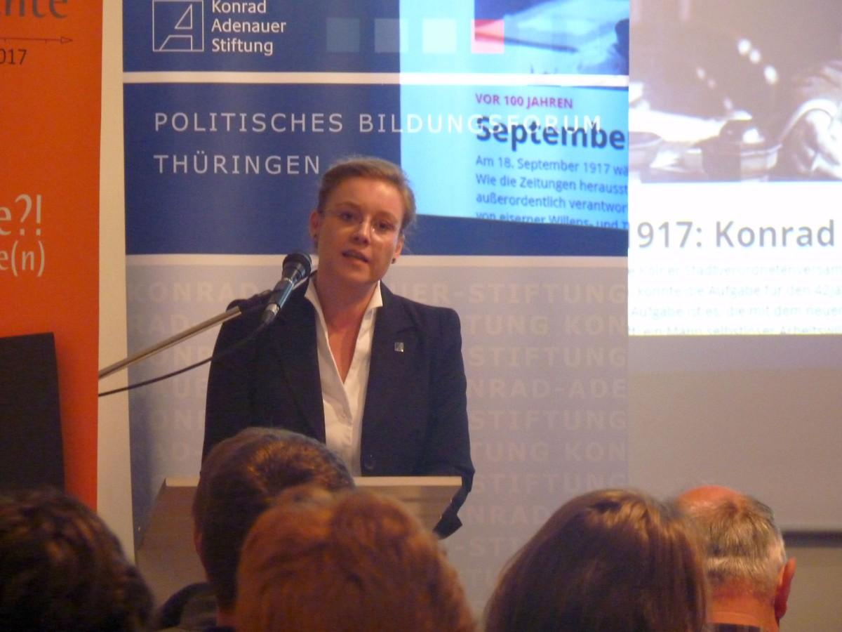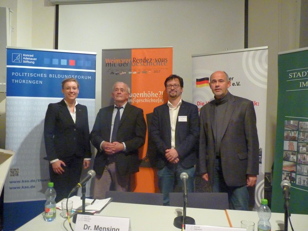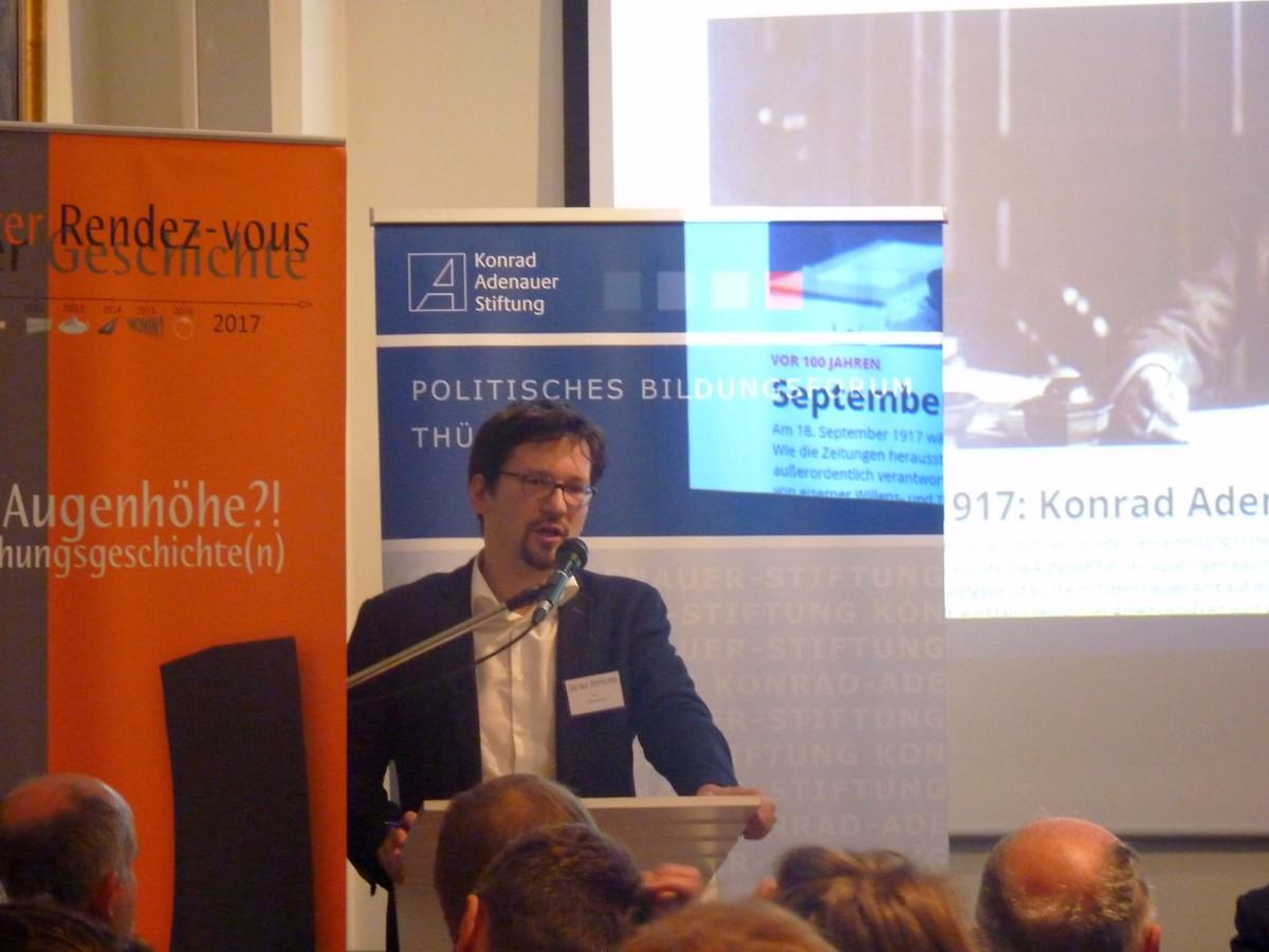 Am 10. November 2017 lud das Politische Bildungsforum Thüringen der Konrad-Adenauer- Stiftung gemeinsam mit dem Weimarer Republik e.V. im Rahmen des Geschichtsfestivals Weimarer Rendez-vous zu einem Vortrag mit anschließendem Podiumsgespräch: „Bindung nach Westen, Verständigung nach Osten-Adenauer und die Außenpolitik der jungen Bundesrepublik“ in das Weimarer Stadtmuseum ein. Die jahrzehntelange Verfälschung des Adenauer-Bildes in der ehemaligen DDR wirkt noch in vielen Köpfen nach. Daher ist es der Konrad-Adenauer-Stiftung ein dauerhaftes Anliegen, dieser Verzerrung entgegenzuwirken.