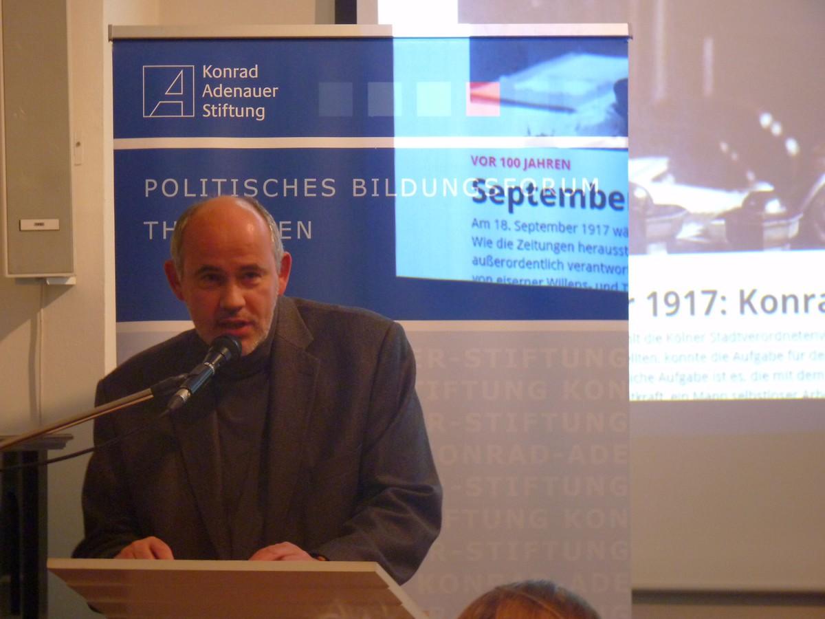 Die Landesbeauftragte für den Freistaat Thüringen der KAS, Maja Eib, begrüßte zu Beginn die ca. 50 Teilnehmer, darunter zahlreiche Studenten, aber auch Schüler des Weimarer Humboldt-Gymnasiums. Im Rahmen dessen zitierte sie den ehemaligen Thüringer Ministerpräsidenten und Ehrenvorsitzenden der Adenauer-Stiftung Bernhard Vogel mit den Worten, Adenauer sei zuallererst ein Pragmatiker gewesen, ein Realist, aus dem ein Visionär wurde. Im Anschluss daran übergab Maja Eib das Wort an den Vortragenden des Nachmittags, den Historiker Dr. Hans Peter Mensing, der als einer der intimsten Kenner des politischen Denkens Konrad Adenauers bezeichnet werden kann. Dr. Mensing leitete bis zum Eintritt in den Ruhestand den Editionsbereich der Stiftung Bundeskanzler-Adenauer-Haus und verantwortete in dieser Funktion die seit 1983 in der „Rhöndorfer Ausgabe“ erscheinenden Editionen aus dem Nachlass Konrad Adenauers.