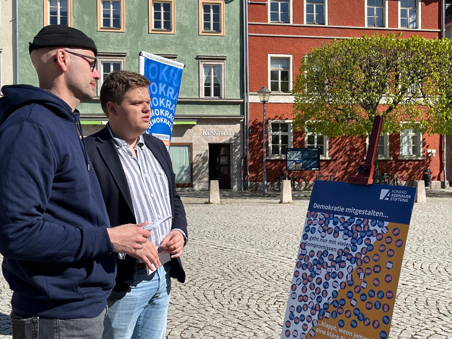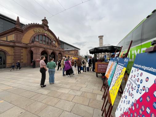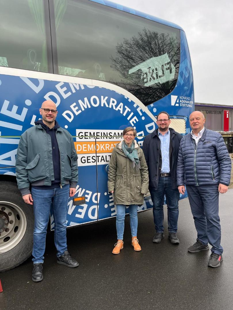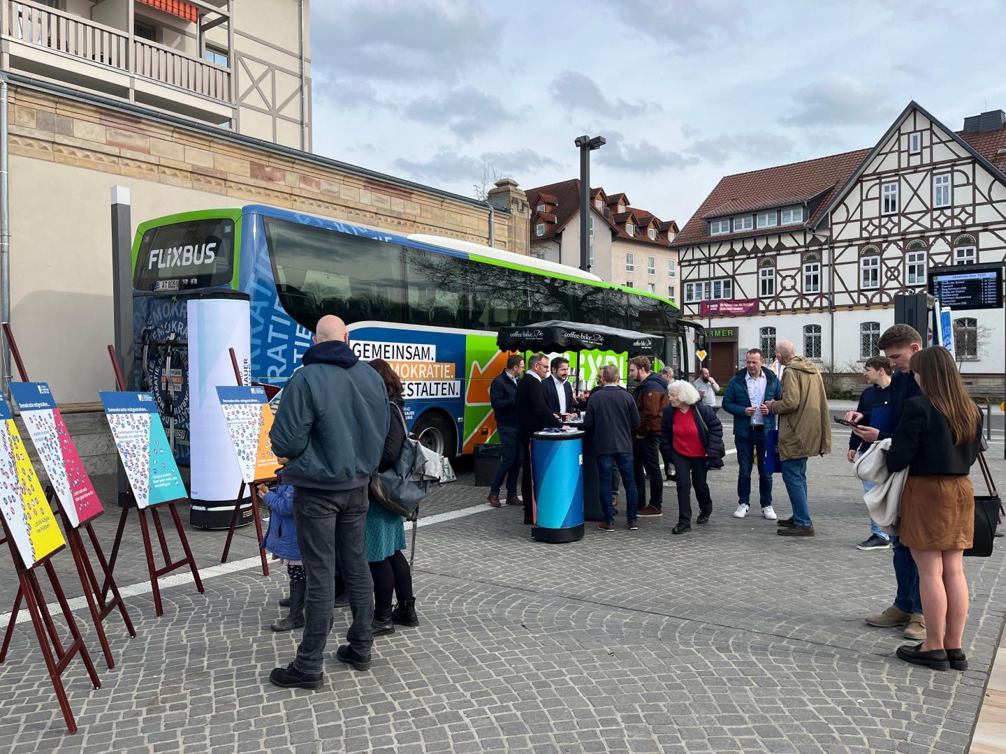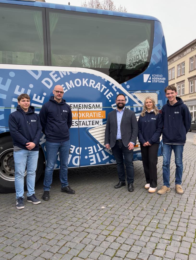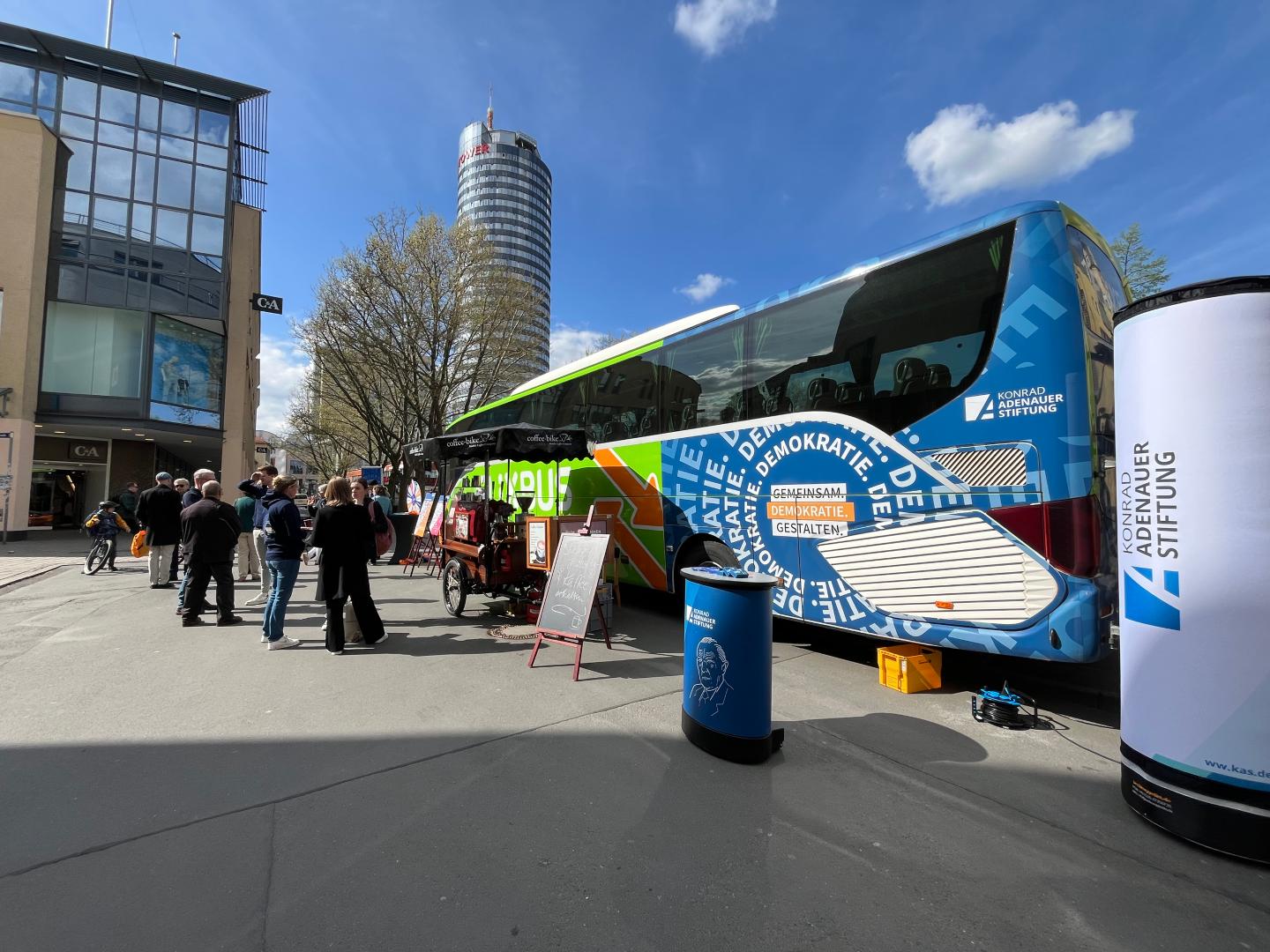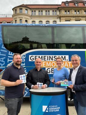 In den zurückliegenden Wochen war das Team der Konrad-Adenauer-Stiftung mit dem Demokratie-Bus in ganz Thüringen unterwegs. In der ersten Woche ging es von Mühlhausen, über Saalfeld und Rudolstadt, weiter Bad Salzungen, Heilbad Heiligenstadt und Teistungen. In der zweiten Woche waren wir in Sonneberg, Erfurt, Jena und Weimar zu Gast. Neben zahlreichen Informationsständen und tiefgründigen Gesprächen mit den Bürgerinnen und Bürgern standen u.a. auch Exkursionen zum Grenzlandmuseum Eichsfeld, der Point-Alpha-Stiftung, zu einem landwirtschaftlichen Agrarbetrieb und dem DHL-Paketzentrum Nohra auf dem Programm. Unterstützt wurden wir dabei von vielen Amts- und Mandatsträgern.