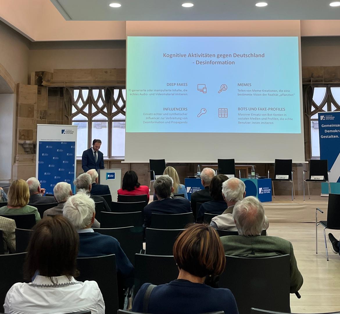 Im Anschluss daran sprach Mateusz Łabuz, Forscher am Institut für Friedensforschung und Sicherheitspolitik an der Universität Hamburg (IFSH). In seinem Impulsreferat ging er auf die enge Verknüpfung von Cyberraum und Informationsraum ein und erklärte anschaulich den Unterschied zwischen Desinformation und Misinformation. Ein Schwerpunkt lag auf dem handlungsorientierten Vorgehen russischer Akteure im Bereich Desinformation, die durch gezielte Falschmeldungen, psychologische Einflussnahme und digitale Manipulation gesellschaftliche Debatten unterwandern und Unsicherheiten schüren.