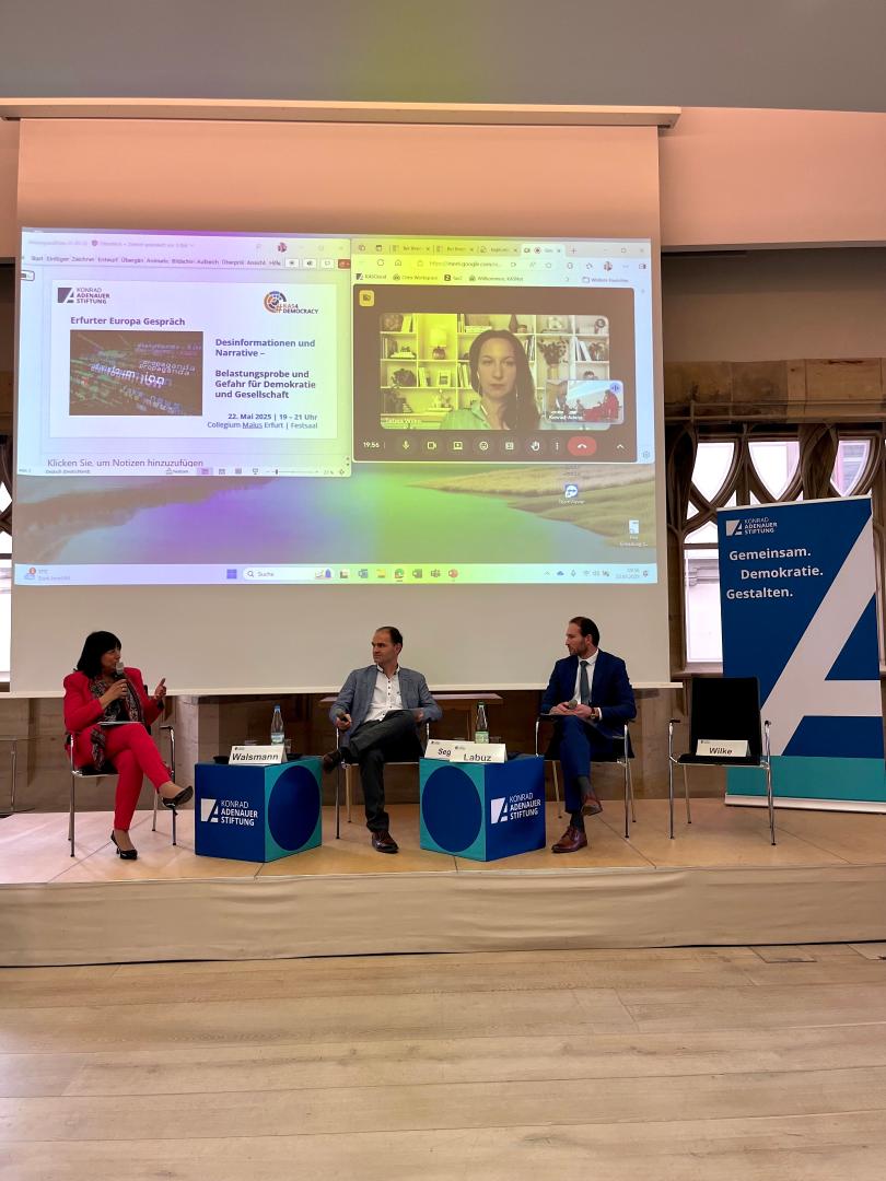 Am 22. Mai 2025 fand im Collegium Maius in Erfurt das Erfurter Europagespräch zum Thema „Desinformation und Narrative – Belastungsprobe und Gefahr für die Demokratie und Gesellschaft“ statt. Die vom Politischen Bildungsforum Thüringen der Konrad-Adenauer-Stiftung organisierte Veranstaltung brachte Expertinnen und Experten aus Wissenschaft, Politik und Gesellschaft zusammen, um über die wachsenden Gefahren durch digitale Desinformation zu diskutieren und nach Lösungen zu suchen.