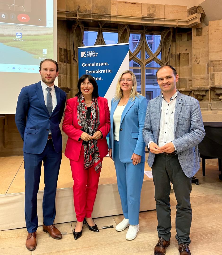 Die Podiumsdiskussion, moderiert von Tim Segler (ein Sicherheitsexperte, Publizist und Tagungsleiter der Konrad-Adenauer-Stiftung, der sich auf Themen der inneren Sicherheit, Extremismusprävention und digitale Desinformation spezialisiert hat), bot anschließend Raum für einen offenen und lebendigen Austausch. Neben Mateusz Łabuz und Marion Walsmann war auch Tabea Wilke, Gründerin von Botswatch, online zugeschaltet. Besonders bereichernd war die Diskussion über den Einfluss von Künstlicher Intelligenz und Anwendungen wie ChatGPT auf die öffentliche Meinungsbildung. Das Publikum beteiligte sich engagiert und stellte kritische Fragen zu den Risiken dieser Technologien und ihrer Rolle bei der Verbreitung von Desinformation.