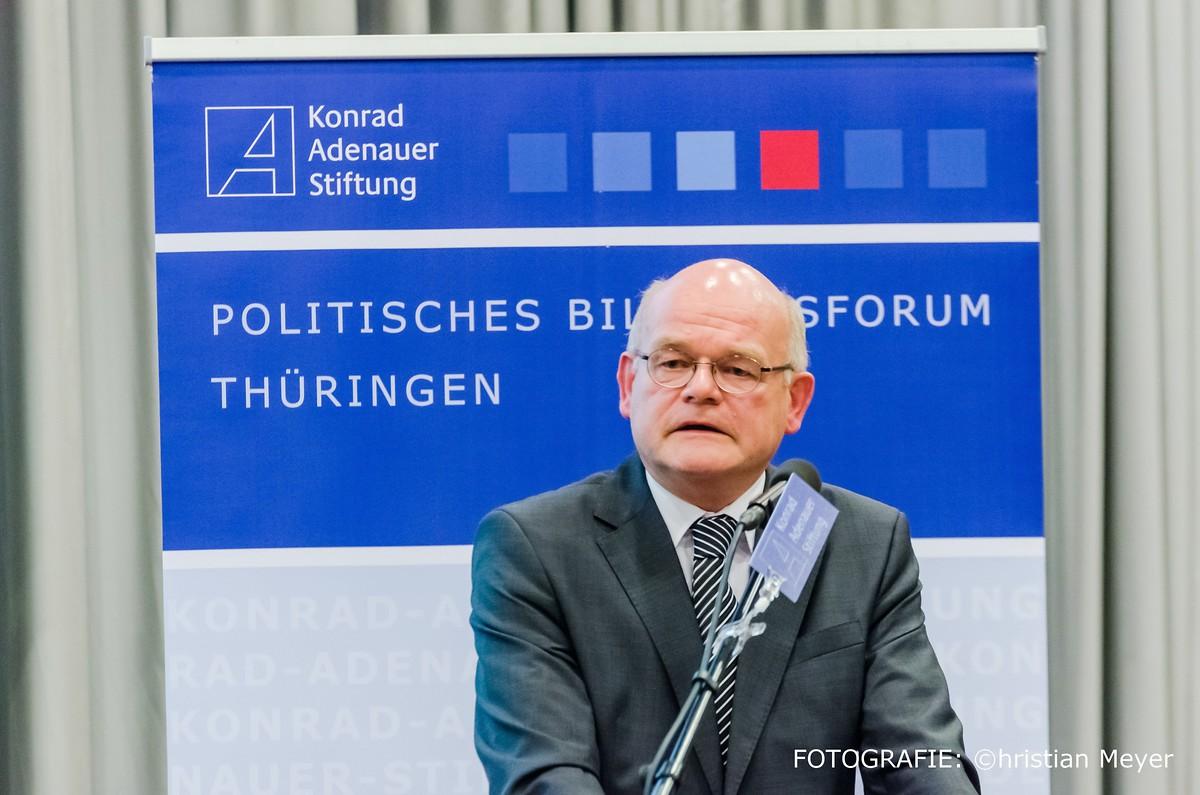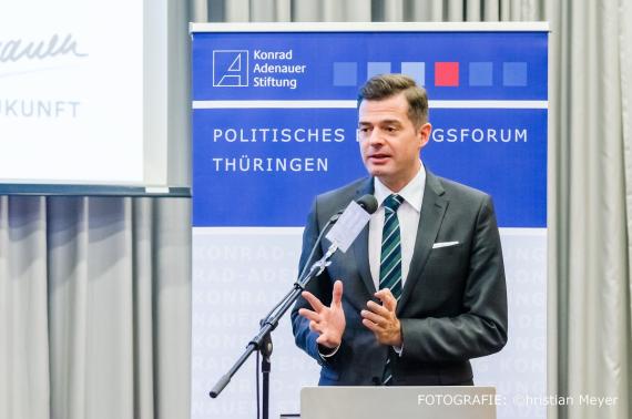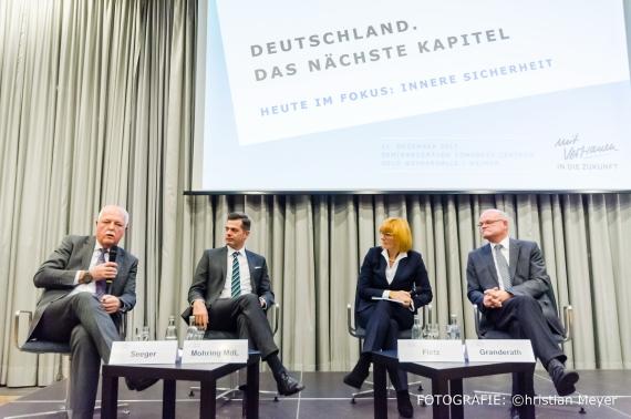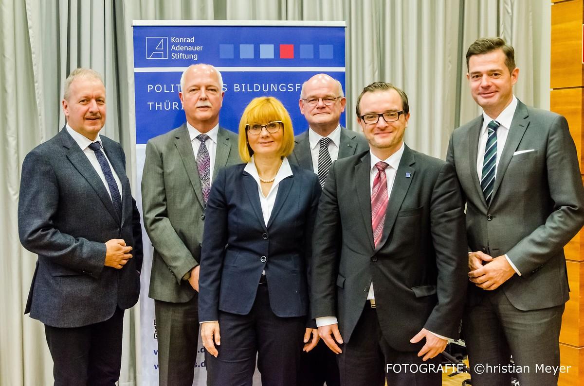 Im Dezember vor einem Jahr richtete der Tunesier Anis Amri auf dem Weihnachtsmarkt am Berliner Breitscheidplatz ein Blutbad an. Im Nachhinein kam eine Kette von schweren Fehlern ans Licht: Amri war ein bekannter Islamist, Gefährder und verurteilter Straftäter, der eigentlich hätte abgeschoben werden sollen, aber stattdessen mit diversen Identitäten umherzog, die Behörden täuschte, sich der Polizei entzog - und am Ende zwölf Menschen tötete und Dutzende verletzte. Aus Anlass der Jährung dieses für Deutschland einschneidenden Anschlagsereignisses lud am 11. Dezember 2017 das Politische Bildungsforum Thüringen der Konrad-Adenauer-Stiftung in die Weimarhalle zu einer Vortrags- und Diskussionsveranstaltung über die Herausforderungen in der inneren Sicherheit Deutschlands. Als Redner und Podiumsgäste waren Joachim Seeger (Abteilungsleiter im Bereich Rechtsextremismus des Bundesamtes für Verfassungsschutz), Peter Granderath (Präsident des Landgerichts Gera) und Mike Mohring MdL (Vorsitzender der CDU-Fraktion im Thüringer Landtag) anwesend. Die Moderation der Veranstaltung übernahm Martina Fietz Chefkorrespondentin von Focus Online.