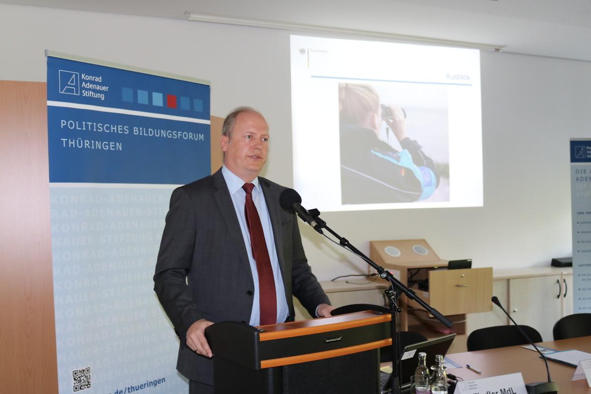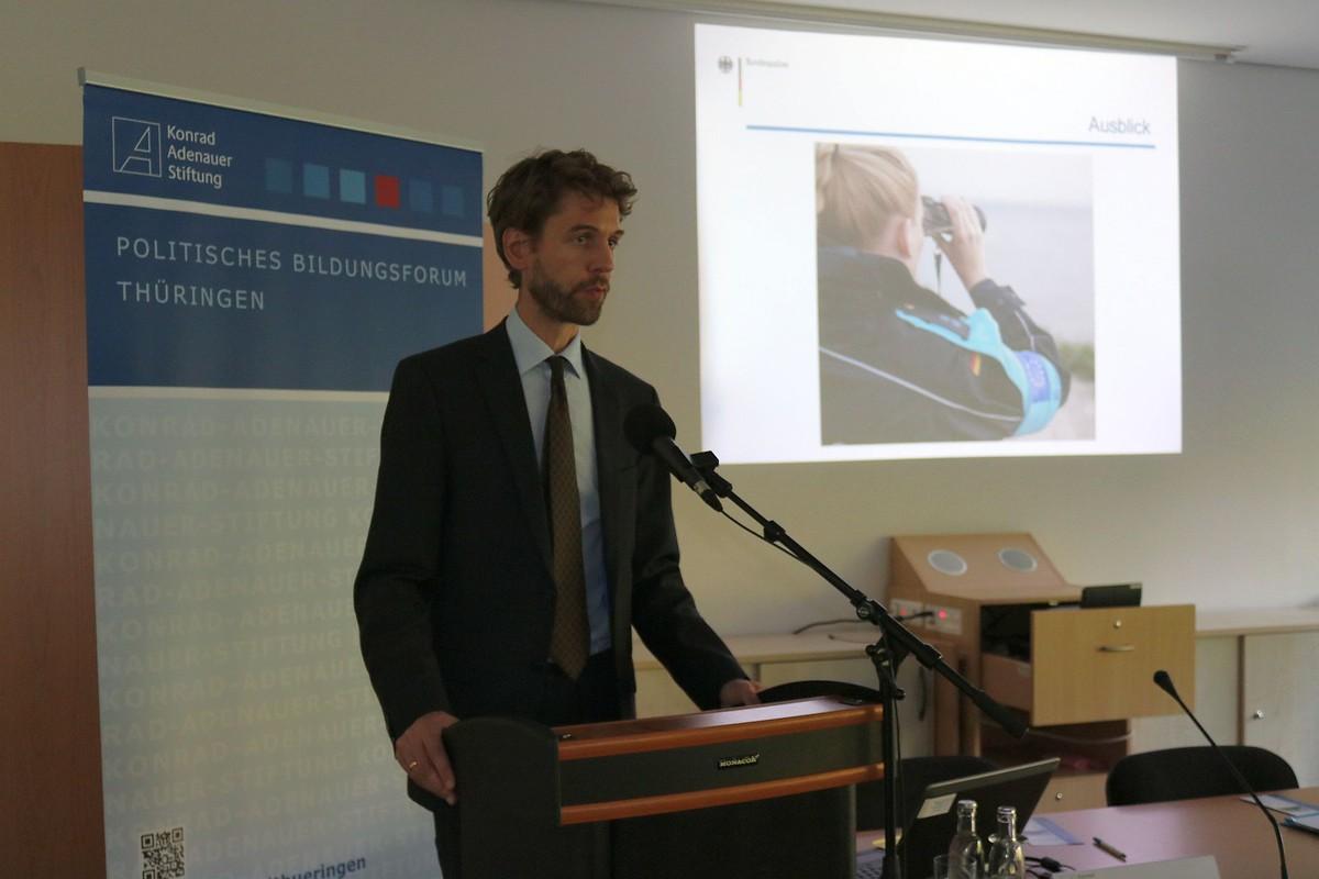 Alexander Fritsch, Leitender Polizeidirektor, Referatsleiter im Bundespolizeipräsidium für die EU-Zusammenarbeit, Frontex Angelegenheiten und Gemeinsame Zentren der Polizei und des Zolls, sowie Nikolaus von Peter, Politischer Referent in der Vertretung der Europäischen Kommission in Deutschland sprachen aus Expertensicht zum Thema. Die Landtagsabgeordneten Marion Walsmann MdL, Europapolitische Sprecherin der CDU-Fraktion im Thüringer Landtag und Wolfgang Fiedler MdL, innenpolitischer Sprecher der CDU-Fraktion im Thüringer Landtag zu Wort und äußerten sich zu Frontex aus einer regionalpolitischen Perspektive.