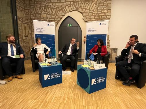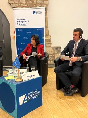 In der anschließenden Diskussionsrunde wurden vor allem der schleppende Beitrittsprozess kontrovers diskutiert. Walsmann betonte, dass durch die Erweiterung der EU das Festhalten am Einstimmigkeitsprinzip auf Dauer nicht möglich sei, da dies die Gefahr birge, dass Einzelinteressen von Nationalstaaten über EU-Interessen gestellt würden. Es brauche institutionelle Reformen, um diese Herausforderungen zu lösen. Poposki wies in diesem Zusammenhang darauf hin, dass die Auflagen immer strenger würden, gerade in Bezug auf die Rechtsstaatlichkeit. Trotz vieler Verbesserungen sei der Beitritt weiterhin nicht möglich, obwohl große Anstrengungen unternommen würden. Er fordere daher eine Aufnahme in die EU, um sich weiterzuentwickeln und grundsätzlich die Rückkehr zu den drei Grundprinzipien der EU, dem Vereinen, der wirtschaftlichen Prosperität und den gemeinsamen Werten als zentrale Kriterien.