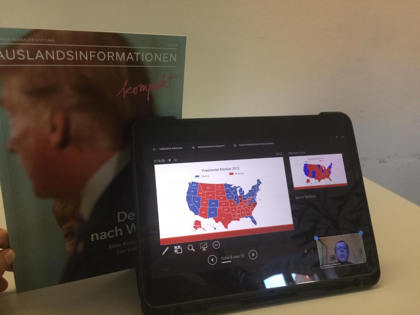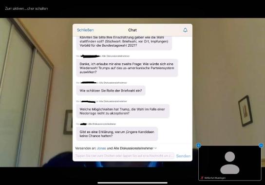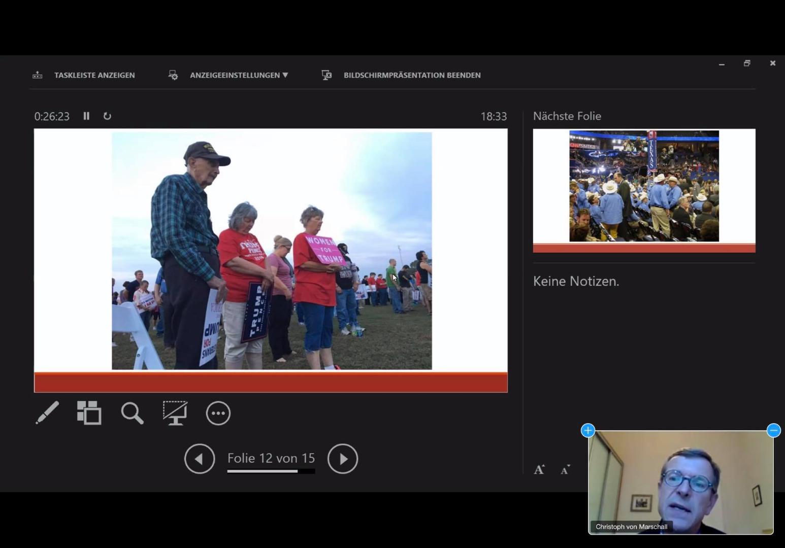Nach einem überaus spannenden und lehrreichen 30-minütige Vortrag schloss sich eine Fragerunde an. Trotz des digitalen Zoom-Formats nahmen die Teilnehmer über die Chatfunktion lebhaft und interessiert teil. So wurde u.a. noch die Relevanz der Briefwahl für die Wahlen besprochen oder der Einfluss von verschiedenen Minderheiten wie die Afroamerikaner oder die Hispanics auf den Wahlausgang. Auf die Frage nach seinem Bauchgefühl, wer den die Wahl gewinnen würde, wagte von Marschall die Prognose, dass Biden der nächste US-amerikanische Präsident sein würde, wenn heute, der 07.09, Wahlen gewesen wären.