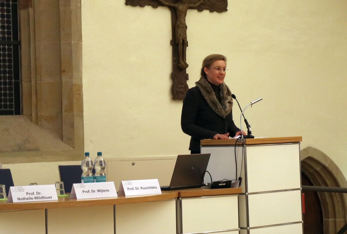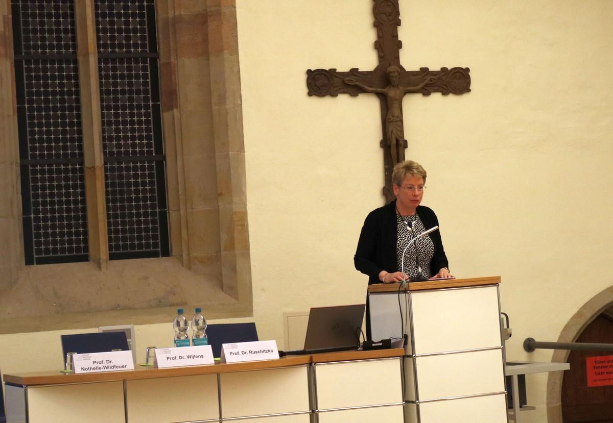 Anschließend referierte Prof. Dr. Ursula Nothelle-Wildfeuer, Professorin für Praktische Theologie, Albert-Ludwigs-Universität Freiburg, seit 2011 Beraterin der Kommission für gesellschaftliche und soziale Fragen der Deutschen Bischofskonferenz, und bildete mit ihrem Impulsvortrag den Spannungsbogen für die Podiumsdiskussion. Sie widmete sich dabei der Frage, ob die soziale Marktwirtschaft gegen Globalisierung und Digitalisierung Zukunft hat. Nothelle-Wildfeuer machte auf aktuelle Transformationsprozesse aufmerksam, die Politik, Wirtschaft und Gesellschaft zunehmend prägen. In ihren Überlegungen stellte sie die Aspekte des Wandels dar, die sich in Arbeit 4.0, also dem spezifischen Umbruch des 21. Jahrhunderts, artikulieren, entwickelte hieraus die Würde der menschlichen Arbeit und schlussfolgerte sozialethische Gebote für die Arbeit 4.0.