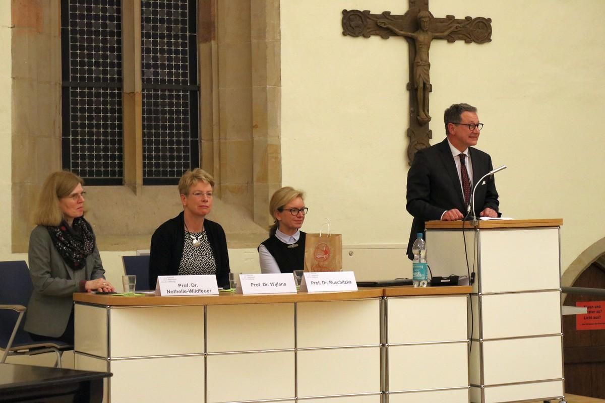 Moderiert von Prof. Dr. Myriam Wijlens, Professorin für Kirchenrecht an der Katholisch-Theologischen Fakultät der Universität Erfurt, diskutierten Prof. Dr. Ursula Nothelle-Wildfeuer und Prof. Dr. rer. nat. Margot Ruschitzka, Unternehmensberaterin für Innovation und Technologie, Professorin für Ingenieurmathematik und Datenverarbeitung an der Technischen Hochschule Köln, zum Thema. In ihren Antworten wurden ihre Haltungen zur Arbeit 4.0 klar. Während Nothelle-Wildfeuer eher auf die Gefahren der fortschreitenden Digitalisierung aufmerksam machte, wies Roschitzka auf die Chancen dieser Entwicklung hin. So verwies sie in ihrem Statement zu Nothelle-Wildfeuers Vortrag darauf, dass die Digitalisierung kein ganz neues Phänomen sei. Der Prozess habe sich in den letzten Jahren nur rasant beschleunigt. Dennoch sollte Menschlichkeit eine größere Rolle in der Arbeitswelt einnehmen. Der Schritt zur Digitalisierung stelle eine bewusste Entscheidung dar. Mit dem, was man nun hat, muss gearbeitet werden und darüber nachgedacht werden, wie mit dem Produkt der mannlosen Fabrik umgegangen wird. Hier gilt es passende Arbeitsschutzgesetze anzuwenden. Auch Billiglohnländer seien keine Erfindung der Neuzeit. Die Frage sei eher, was in dieser neuen Debatte herausgearbeitet werden soll. Diese Prozesse seien beeinflussbar. Neue Technologien bringen uns teilweise würdigere Rahmenbedingungen. Daher muss ein disziplinierter Umgang mit den Prozessen stattfinden.