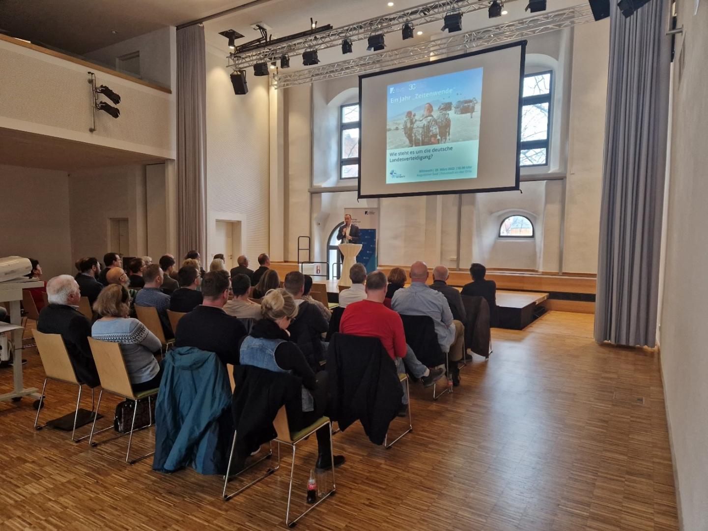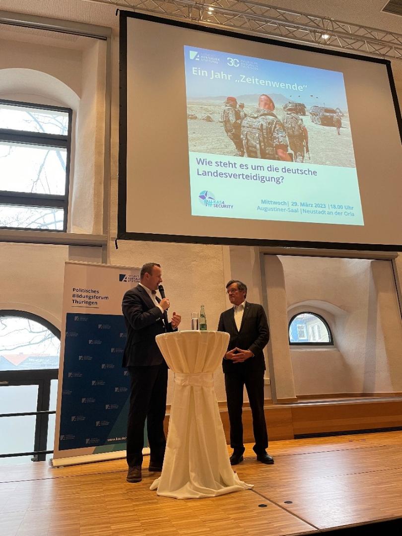 Mit der sogenannten „Zeitenwende“, welche vor einem Jahr durch den Angriff Russlands auf die Ukraine eingeleitet wurde, rückte auch in Deutschland die Außen- und Verteidigungspolitik verstärkt in den politischen und gesellschaftlichen Fokus. Im Sommer 2022 wurde ein einmaliges Sondervermögen in Höhe von 100 Milliarden Euro für die Bundeswehr bereitgestellt, mit dem derzeit und zukünftig die Bündnis- und Verteidigungsfähigkeit Deutschlands gestärkt werden soll. Im Zuge dessen wurde sich am 29. März 2023 in Neustadt an der Orla mit der Frage auseinandergesetzt, wie es derzeit um die deutsche Landesverteidigung steht. Mit dem geladenen Experten Rainer Meyer zum Felde, Brigadegeneral a.D. und Senior Fellow am Institut für Sicherheitspolitik an der Universität Kiel, sowie Christian Herrgott MdL, Mitglied des Thüringer Landtags und Beauftragter der CDU-Fraktion für die Bundeswehr, hat eine spannende und interessante Gesprächsrunde stattgefunden, die durch einen regen Austausch mit dem Publikum geprägt war.