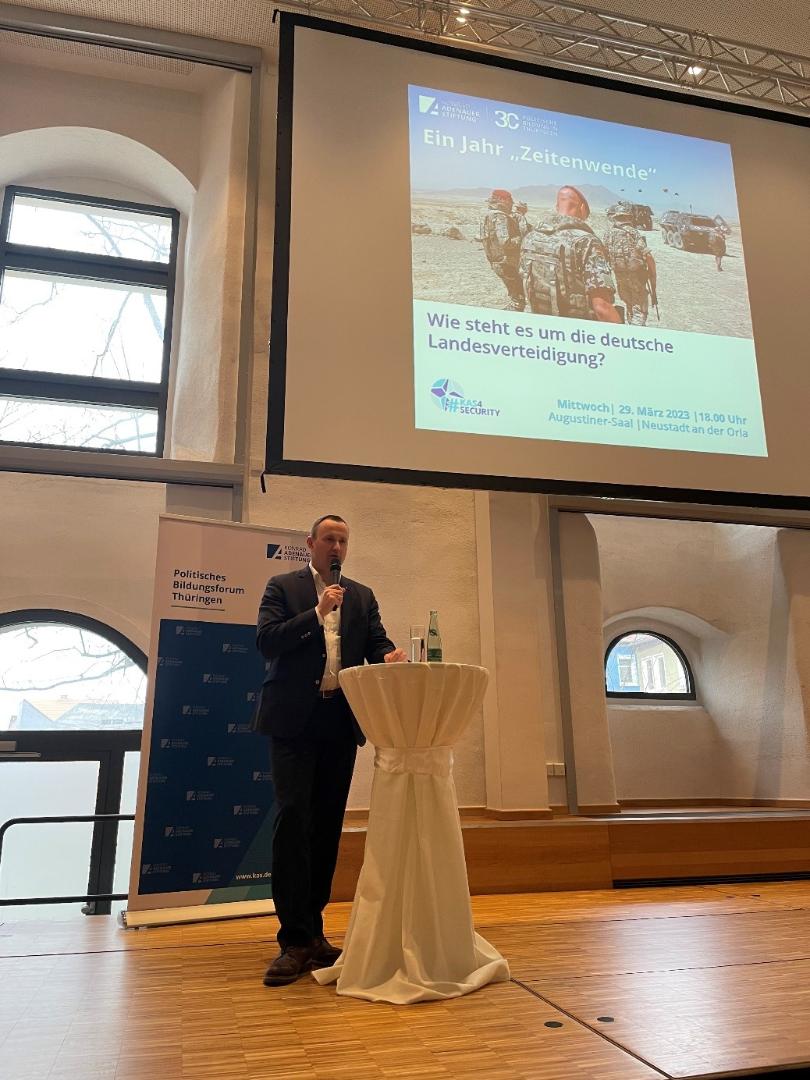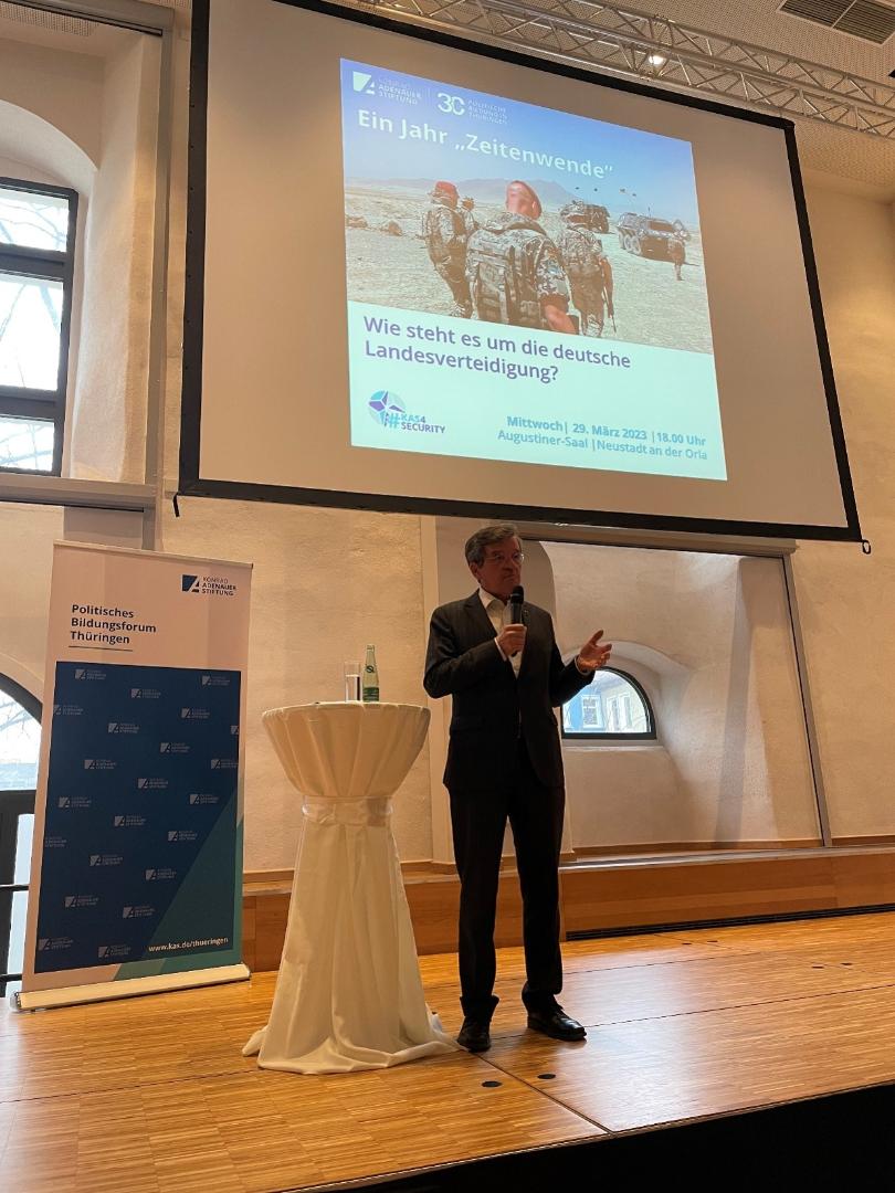 Christian Herrgott MdL bezeichnete die Bundeswehr als die „Sparbüchse des Haushaltes“, die in den letzten Jahren sträflich vernachlässigt wurde. Mit dieser Auffassung stimmte Rainer Meyer zum Felde überein: Es stand noch nie so schlecht um die deutsche Landesverteidigung. Im Schutz Europas nahm Deutschland in den vergangenen Jahren vorrangig die Rolle des Krisenmanagements ein, sodass die Bundeswehr ein „besseres technisches Hilfswerk mit Selbstschutzkomponente“ darstellt. Infolge der Zeitenwende ist die Bundeswehr jedoch wieder in das Bewusstsein der Öffentlichkeit und Politik getreten. Neben dem Sondervermögen sollen jährlich zwei Prozent des BIP (Bruttoinlandprodukts) in die Bundeswehr investiert werden, um diese aufzurüsten. Dadurch soll Deutschland im Nato-Bündnis mehr Verantwortung übernehmen und die Rolle als „Rückgrat der konventionellen Bündnisverteidigung“ einnehmen. Insgesamt muss die Bundeswehr wieder in die Lage versetzt werden, dass ihr eine Durchhaltefähigkeit von 30 Gefechtstagen zugesprochen werden kann. Zudem besteht ein dringender Bedarf in der Anschaffung materieller und personeller Ressourcen. Der NATO wurde zugesichert, dass von Deutschland bis 2027 die erste von insgesamt drei Divisionen bereitgestellt wird. Laut dem derzeitigen Stand könnte diese womöglich bereits im Laufe des Jahres 2025 einsatzbereit sein.