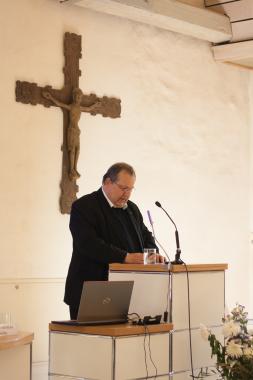 Die Moderation des Abends und der anschließenden Podiumsdiskussion übernahm Prof. Dr. Myriam Wijlens, Professorin für Kirchenrecht an der Katholisch-Theologischen Fakultät der Universität Erfurt. Sie machte deutlich, dass Barmherzigkeit nicht nur für Gläubige von Interesse sei und stellte den Referenten Prof. Dr. Clemens Dölken OPraem, Professor für christliche Sozialwissenschaft an der philosophisch-theologischen Hochschule SVD Sankt Augustin vor. Im ersten Vortrag des Abends veranschaulichte Dölken anhand von 10 Thesen die Thematik. Er begann mit der Prämisse, dass Wirtschaft immer unter dem Aspekt der Versorgung der Konsumenten mit Gütern betrachtet werden müsse. Nachfolgend erläuterte er den Begriff der Barmherzigkeit und brachte ihn mit Gerechtigkeit in Verbindung. Diese beiden und die Anwendung von Ethik im Allgemeinen seien nicht nur für gläubige Menschen von Relevanz, sodass alle Verantwortung im wirtschaftlichen Handeln übernehmen müssten. Dölken sah es als notwendig an, dass Ethik zur „Chefsache“ erklärt werde, diese aber auch strategisch genutzt werden würde, um sich auf dem Markt von Konkurrenten abzuheben. Da Barmherzigkeit und damit verbunden Gerechtigkeit auf der Welt aber unterschiedlich aufgefasst werden, ist nach Ansicht des Referenten eine Diskussion über die Umsetzung von Menschenrechten durch ethische Normen notwendig, vor allem in der Wirtschaft. Trotzdem würden sich Unternehmer oft in Dilemma-Situationen wiederfinden und vor dem Hintergrund des Wettbewerbs und dessen Bedingungen die Kontingenz von ethischen Normen in der modernen Gesellschaft erfahren. Die Aufgabe sei eine institutionelle Implementation von Ethik, damit diese in der Wirklichkeit Raum greifen kann, ohne darauf reduziert zu werden.