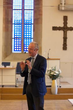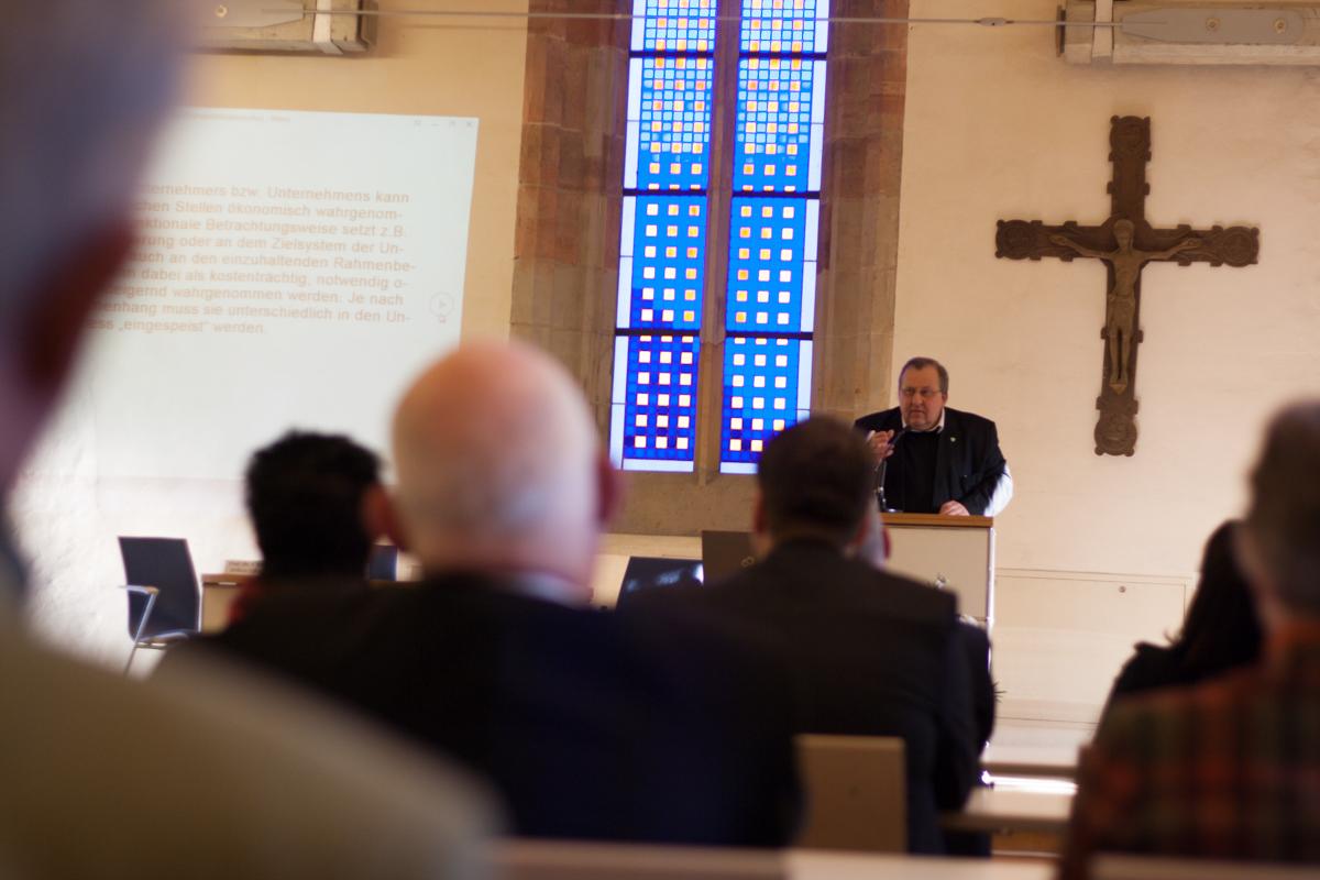 In dem sich anschließenden Vortrag lehnte DDr. Rusche, Inhaber der SØR Rusche GmbH aus Oelde, als katholischer Unternehmer die Begriffe „Gewinnmaximierung“ und „Kostenminimierung“ sowie die Betrachtung des Menschen als Kostenfaktor, mit dem es zu wirtschaften gelte, ab. Stattdessen gelte es, sich in der weit verbreiteten „Ellenbogenmentalität“ der Wirtschaft für solidarisches Handeln des Unternehmens als auch des Individuums einzusetzen. Der erste Schritt sei es, nicht aus einer Institutions- sondern einer Individualethik heraus jeden einzelnen wahrzunehmen, ihm zuzuhören und in der Arbeit in einem Unternehmen Entfaltungsräume und möglichkeiten zu bieten. Aus dieser Perspektive stellen Barmherzigkeit und Wirtschaft für Rusche auch keinen Widerspruch dar. Auch in Dilemma-Situationen und in Zeiten hoher Konkur-renz sei solidarisches Handeln möglich und notwendig.