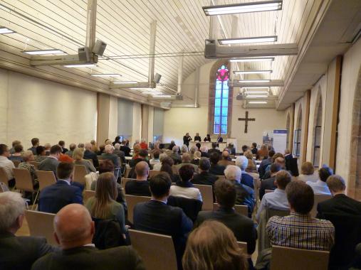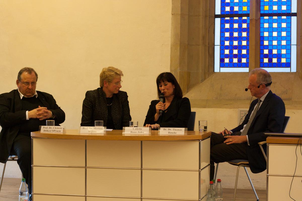 Nach dem Vortrag von DDr. Rusche schloss sich eine Podiumsdiskussion an, die im weiteren Verlauf durch Fragen aus dem Zuschauerraum ergänzt wurde. Die Unternehmerin Colette Boos-John der Bauer Bauun-ternehmen GmbH aus Walschleben vertrat die Ansicht, dass man jeden Angestellten so behandeln müsse, wie man auch selbst behandelt werden möchte. Dieses Leitbild, dem sie folge, impliziere die Anwendung von Barmherzigkeit und der Gerechtigkeit. Trotzdem existiere ein spannungsreiches Verhältnis zwischen beiden Polen, da Entscheidungen getroffen werden müssten, die die Existenz des Unternehmens betreffen. Daher könne grad im Verhältnis zwischen Vorgesetztem und Angestelltem nicht immer nur barmherzig ge-handelt werden. Der schlechte Ruf vom Unternehmertum, der nach Boos-John daraus resultiere, müsse allerdings im Licht der Verantwortung der Unternehmer relativiert werden. Auch deshalb sei die Wertever-mittlung für viele Unternehmen daher essentiell. Dölken merkte an, dass Entscheidungen zwar im wirtschaft-lichen Alltag getroffen werden müssten, trotzdem könne man durch Vorausschau und Kommunikation die richtigen Signale setzen.