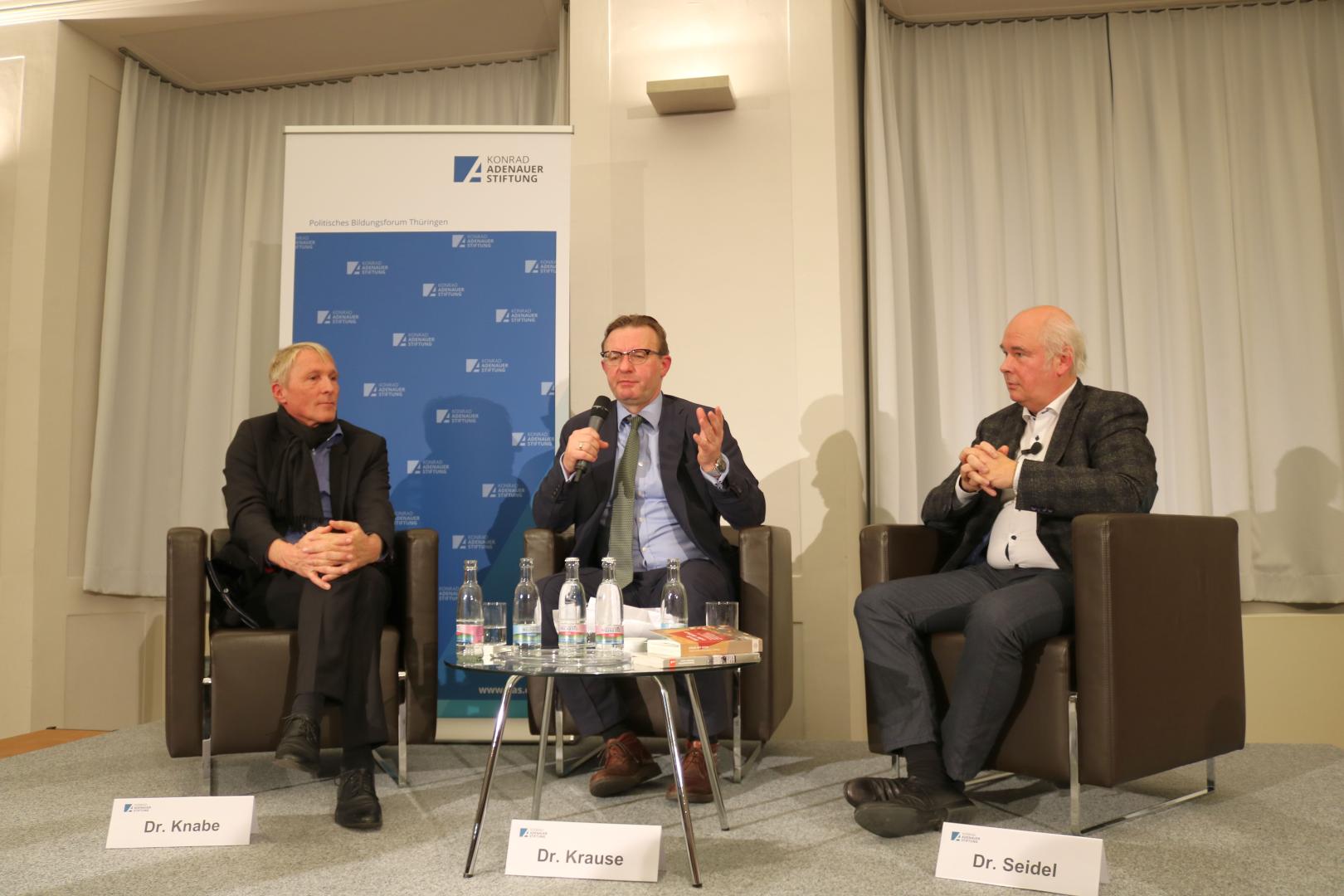 Zu Beginn des Expertengesprächs umriss Dr. Knabe kurz und knapp die verfassungsrechtlichen Vorkehrungen, die 1949 in das deutsche Grundgesetz eingearbeitet wurden, um eine Wiederholung der Beseitigung der Verfassung wie vor dem Zweiten Weltkrieges zu verhindern. Als Beispiele für solche Sicherungen in der Verfassung nannte er das Widerstandsrecht, die Verpflichtung eines Bundeskanzlers bis zur demokratischen Ernennung seines Nachfolgers im Amt zu bleiben und insbesondere die Ewigkeitsklausel, die jede Änderung der ersten 20 Artikel des Grundgesetzes bis in alle Ewigkeit verbietet. Danach sprach er an, dass in den 1950ern die Deutschen lange nicht überzeugt von dem neuen demokratischen Grundgesetz waren. Dies habe sich jedoch langsam gewandelt und sei in eine Art Verfassungspatriotismus übergegangen. Danach kam die Expertenrunde auf die Wiedervereinigung Deutschlands zu sprechen und Dr. Krause postulierte, dass die Politik sich damals möglicherweise zu wenig um eine Legitimation der Ostdeutschen für eine Übernahme der Verfassung der BRD bemüht habe. Laut Dr. Knabe, wurde diese Legitimation jedoch durch die ersten Wahlen in der ehemaligen DDR erreicht, als die Parteien, die die Übernahme der westdeutschen Verfassung in Ostdeutschland vorangetrieben hatten, mehrheitlich gewählt wurden. Dr. Seidel, der zu der Zeit der Wiedervereinigung selbst für eine neue gesamtdeutsche Verfassung eingetreten war, lenkte ein, dass es damals schnell gehen musste, da nicht klar war wie lange sich die Sowjetunion zurückhalten würde, und auch viele Menschen wollten, dass die Verfassung der BRD unverändert für ein einheitliches Deutschland übernommen wird. Die heutzutage zu beobachtende Entfremdung der Bürger von der Politik habe laut Dr. Knabe wenig mit einer verpassten Chance zu Zeiten der Wiedervereinigung und der damaligen Frage der Verfassung zu tun, sondern die Ursachen für diese Entfremdung seien vielmehr in der heutigen Politik und deren Versäumnissen zu suchen. Seiner Meinung nach, wäre es nicht gut gewesen wenn der damalige Verfassungsentwurf für die DDR in eine gesamtdeutsche Verfassung eingeflossen wäre. Zur Frage der Legitimation der Verfassung heutzutage, hatte Dr. Knabe einige Umfrageergebnisse parat, die zeigten, dass die deutsche Bevölkerung zum größten Teil der Meinung ist, das sich das Grundgesetz alles in allem bewährt hat – in Westdeutschland denken das 90% der Befragten und in Ostdeutschland mit 78% etwas weniger, aber immer noch die klare Mehrheit. Im Vergleich dazu, waren deutlich weniger Befragte zufrieden oder sehr zufrieden damit, wie die Demokratie in Deutschland funktioniert (nur 65% der Befragten). Dies zeigt, laut Dr. Knabe, dass zwischen Grundgesetz und Demokratie stark differenziert wird und ersteres bei den Deutschen deutlich besser abschneidet.