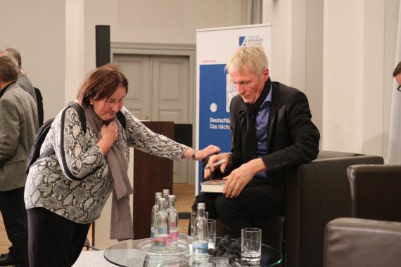 Schließlich kam die Sprache auf heutige Debatten in der Politik, die laut Dr. Krause häufig tiefgreifende Verunsicherungen in der Bevölkerung wiederspiegeln, die er als Folgen falscher Politik einschätzt. Laut Dr. Knabe hängen diese Unsicherheiten mit der Öffnung der Wirtschaft und der Gesellschaft und der voranschreitenden Globalisierung zusammen. Durch diese Veränderungen und die dadurch entstehende wachsende Konkurrenz im wirtschaftlichen, sozialen und gesellschaftlichen Bereich würden Menschen verunsichert werden und sich in eine Gegenreaktion flüchten, die auf Abschottung und Verdrängung basiert. Eine weitere besorgniserregende, aktuelle Entwicklung sei laut den Referenten, dass diese Tendenz, sich im Einzelfall über das Recht hinwegzusetzen ohne die nötigen Verfahren für solche Notsituationen zu durchlaufen, in immer weiteren Kreisen und teils auch von den Medien als legitim dargestellt werde. Er sieht auch eine Gefahr darin, dass relativ kleine Gruppen, teilweise mit Unterstützung von den Medien, die Politik des Landes bestimmen und auch Politiker beeinflussen würden, bestimmte Meinungen aus Angst vor Negativpresse nicht zu vertreten. Dieselbe Angst auf kleinerem Niveau mache sich auch in der Gesellschaft breit, meint Dr. Knabe. Denn viel mehr Menschen hätten mittlerweile Angst sogar im eigenen Freundeskreis ihre Meinung zu sagen oder über „Tabuthemen“ zu sprechen. Ihm mache es Sorgen, dass sich immer mehr Menschen durch sozialen Druck veranlasst fühlen würden sich selbst zu zensieren.