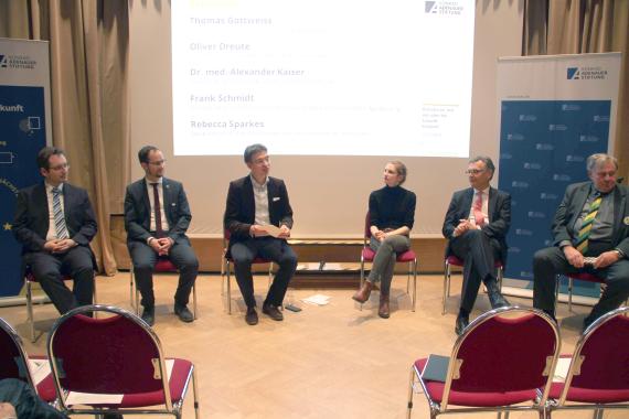 Einleitend stellte Moderator Blum die Frage, was die Referenten mit Europa verbinden würden. Dabei wurden die Reisefreiheit, kulturelle Gemeinsamkeiten, die Vereinheitlichung von Standards in der Forschung und der Frieden auf dem Kontinent von den Diskutanten herausgehoben.