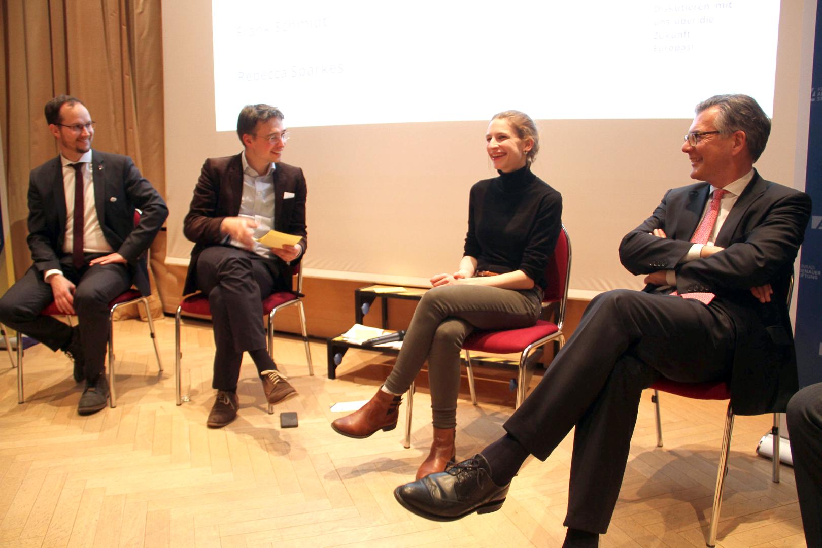Im ersten Themenblock „mehr oder weniger EU wagen?“ hob Blum die Rolle des EU-Parlaments heraus. Auf die Frage, ob es nicht sinnvoll sei die Umzüge des Parlaments zwischen Brüssel und Straßburg zu beenden, erklärte Oliver Dreute, dass sie zwar von den Parlamentariern und Mitarbeitern nicht befürwortet würden, die Umzüge jedoch so lange weiterbestünden, bis sich die Staats- und Regierungschefs der EU einstimmig dagegen entschieden. Frank Schmidt plädierte für eine grundsätzliche Verjüngung der EU, um die junge Generation stärker an Europa teilhaben zu lassen. Thomas Gottweiss hob heraus, dass das Fehlen einer europäischen Öffentlichkeit dazu, dass nur aus nationalen Sichtweisen heraus argumentiert würde. Dies würde den Diskurs erschweren, da nie die EU als Ganzes betrachtet würde.