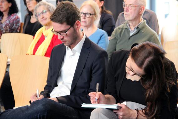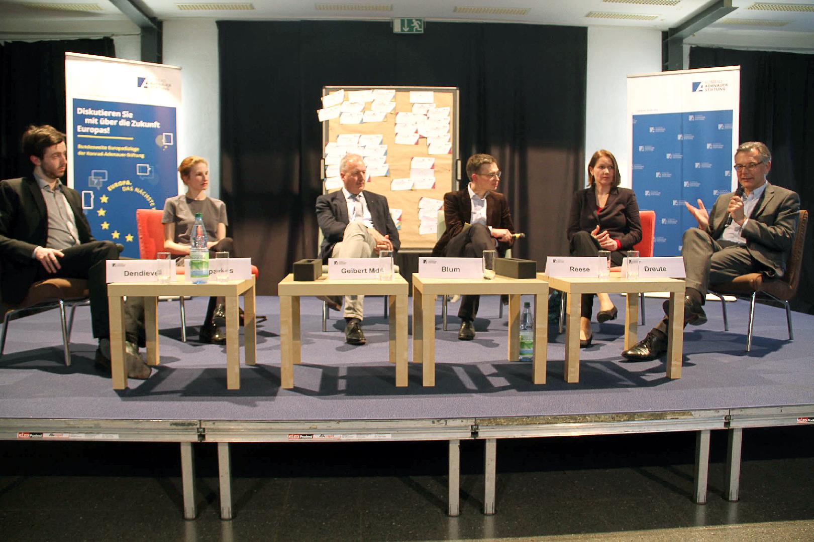 Auch der Brexit wurde angesprochen. Geibert sprach von einem kaum wieder gut zu machendem Verlust. Die Teilnehmer bemängelten, dass eine reflektierte Auseinandersetzung mit dem Brexit fehle und sich die EU nicht intensiv genug mit der Frage beschäftige, wie es dazu gekommen ist. In diesem Zusammenhang sprachen die Referenten von der Frage nach Identität. Nach der Frage, ob die einzelnen Länder ein Stück ihrer eigenen Identität aufgegeben hätten, ergaben sich unterschiedliche Meinungen. Man müsse vor allem den einzelnen Ländern erlauben, sich selbst zu fühlen und ihre eigene Identität zu finden und zelebrieren. Daher solle die EU nicht versuchen alles anzugleichen, denn sonst gehe zu viel nationale Identität verloren. Geibert machte in diesem Zusammenhang deutlich, dass es durchaus möglich sei, die Vorzüge Europas zu genießen, ohne dabei Identität abzugeben. Dreute griff außerdem die Angst der Teilnehmer, Europa werde zu einem Staatengebilde, auf und monierte, dass Europa zu oft schlecht geredet werde, was wiederum zu mehr Nationalismus führe. Die Vorzüge der EU würden die Nachteile deutlich überwiegen und die Deutschen hätten durch Europa eine zusätzliche europäische Identität gewonnen.