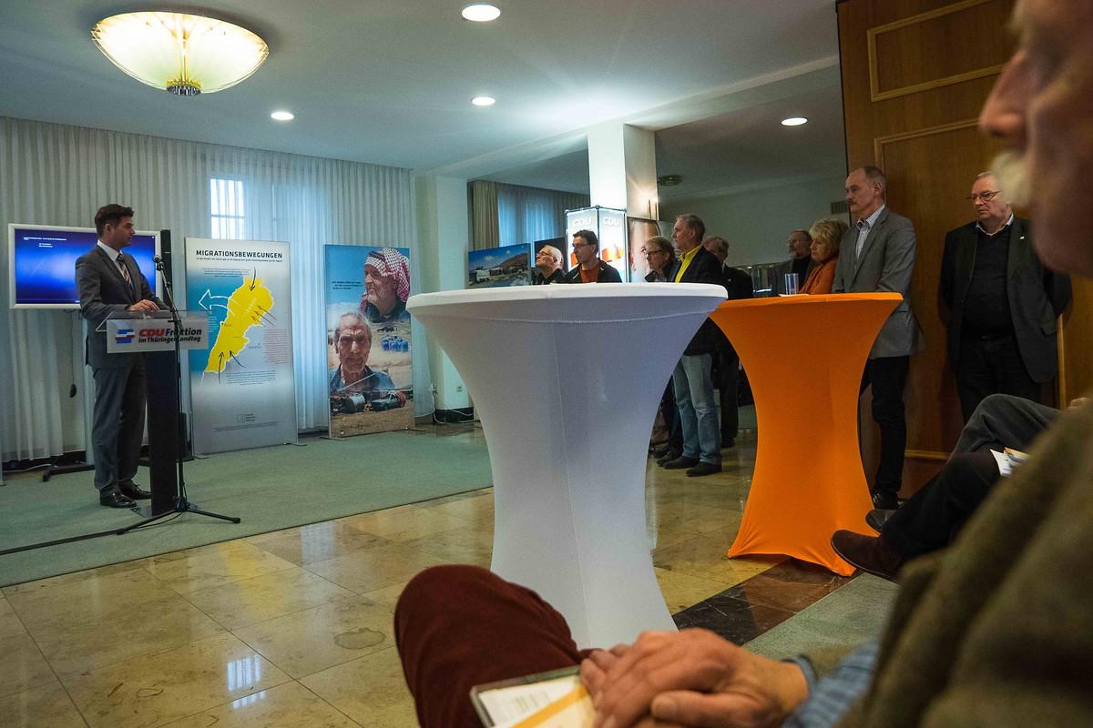 In zwei mal ein Meter großen Fotos gibt die Fotoausstellung „Ganz nah, aber weit genug“ einen Einblick in die Situation von Flüchtlingen im Libanon. Bei der Eröffnung im Landtag Thüringen berichteten die Fotografen und MdL Mike Mohring (CDU) zudem von ihren eigenen Erfahrungen.