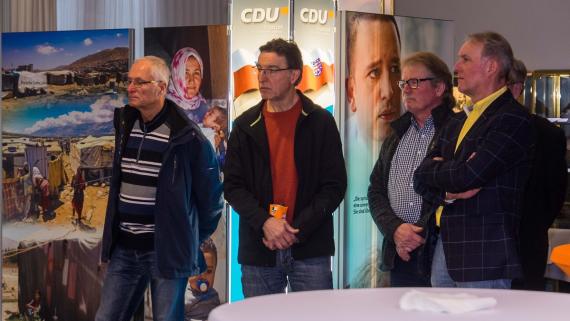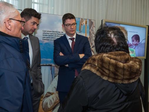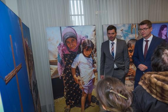 Das Hauptaugenmerk der Ausstellung liegt allerdings auf der Situation der syrischen Flüchtlinge, die unter katastrophalen Bedingungen in improvisierten Lagern direkt hinter der Grenze leben. Selbst die Versorgung mit dem nötigsten wie Wasser, Lebensmitteln und Strom ist dort nicht sichergestellt, obwohl die Flüchtlinge sogar Miete an die Besitzer der Äcker, auf denen sie ihre Lager aufschlagen, zahlen müssen, berichtete Mike Mohring. Er sei überrascht gewesen, dass die vielen Kindern im Flüchtlingslager in Jeb Jenine in der Bekaaebene ihr Lachen nicht verloren hätten und trotz ihrer verzweifelten Situation miteinander spielten und herumalberten, erzählte Mathias Birsens bei der Eröffnung.