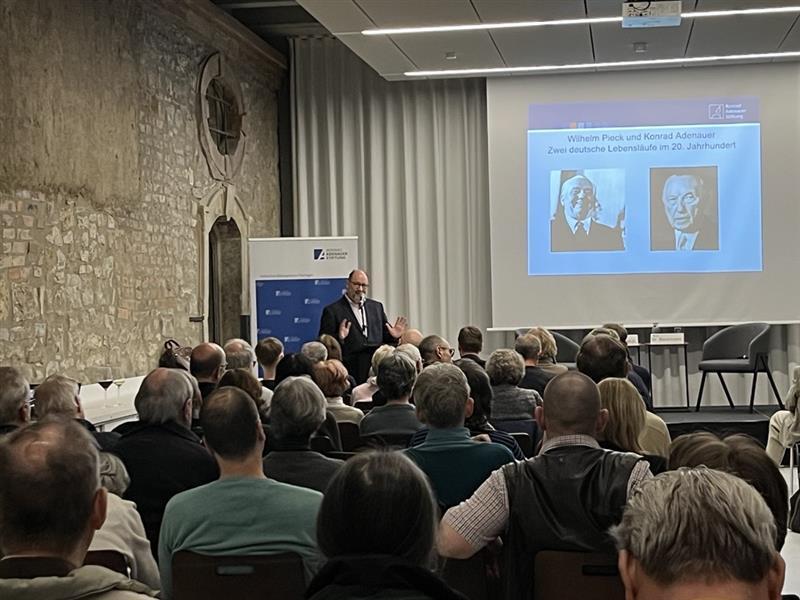 Am 12. Februar 2026 luden der Weimarer Republik e.V. und die Konrad-Adenauer-Stiftung Thüringen zu einer Abendveranstaltung nach Weimar ein, die von Tillmann Bauer, Referent der Konrad-Adenauer-Stiftung in Thüringen, eröffnet wurde. Unter dem Titel „Konrad Adenauer und Wilhelm Pieck – zwei deutsche Lebensläufe im 20. Jahrhundert“ stand ein biografischer Vergleich im Mittelpunkt, der zugleich weit über persönliche Lebensdaten hinausführte. Er ermöglichte den Blick auf zentrale Bruchlinien deutscher Geschichte – von der Weimarer Republik über den Nationalsozialismus bis hin zur deutschen Teilung und deren Nachwirkungen. Das große Interesse zeigte sich schon zu Beginn der Veranstaltung - der Vortragssaal war vollständig gefüllt.