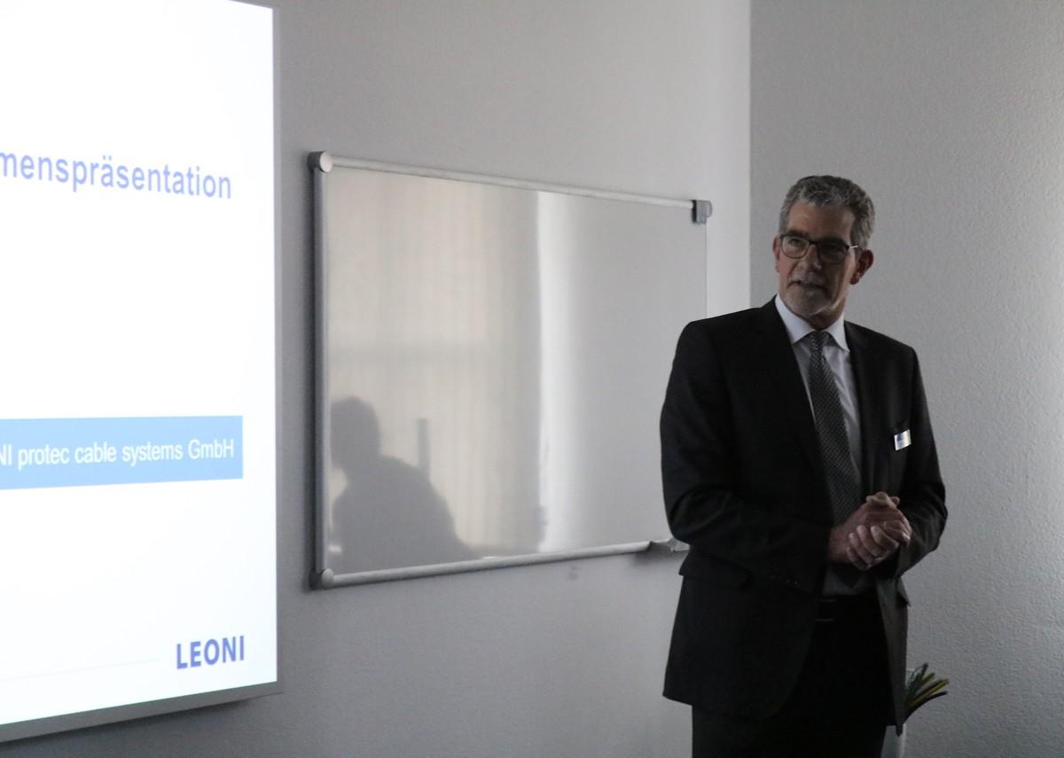 Nach Begrüßung durch Daniel Braun, wissenschaftlicher Mitarbeiter der KAS Thüringen und Mark Hauptmann MdB, stellte René Kuun, Geschäftsführer LEONI Schmalkalden, das Unternehmen vor. Das Unternehmen ist weltweiter Produzent und Anbieter von Drähten, optischen Fasern, Kabeln und Kabelsystemen und beliefert verschiedene Absatzmärkte, darunter die Automobilindustrie und das Gesundheitswesen. Die 139 Beschäftigten am Standort Schmalkalden sind mit der Aufgabe der Herstellung und Produktion von Kabelsystemen betraut. Laut Kuun sei es eine Herausforderung für das Unternehmen qualifizierte Fachkräfte zu finden. Seinen Vortrag endet er mit einer Zukunftsprognose für Aufgaben und Herausforderungen des Unternehmens in Zeiten der Industrie 4.0.