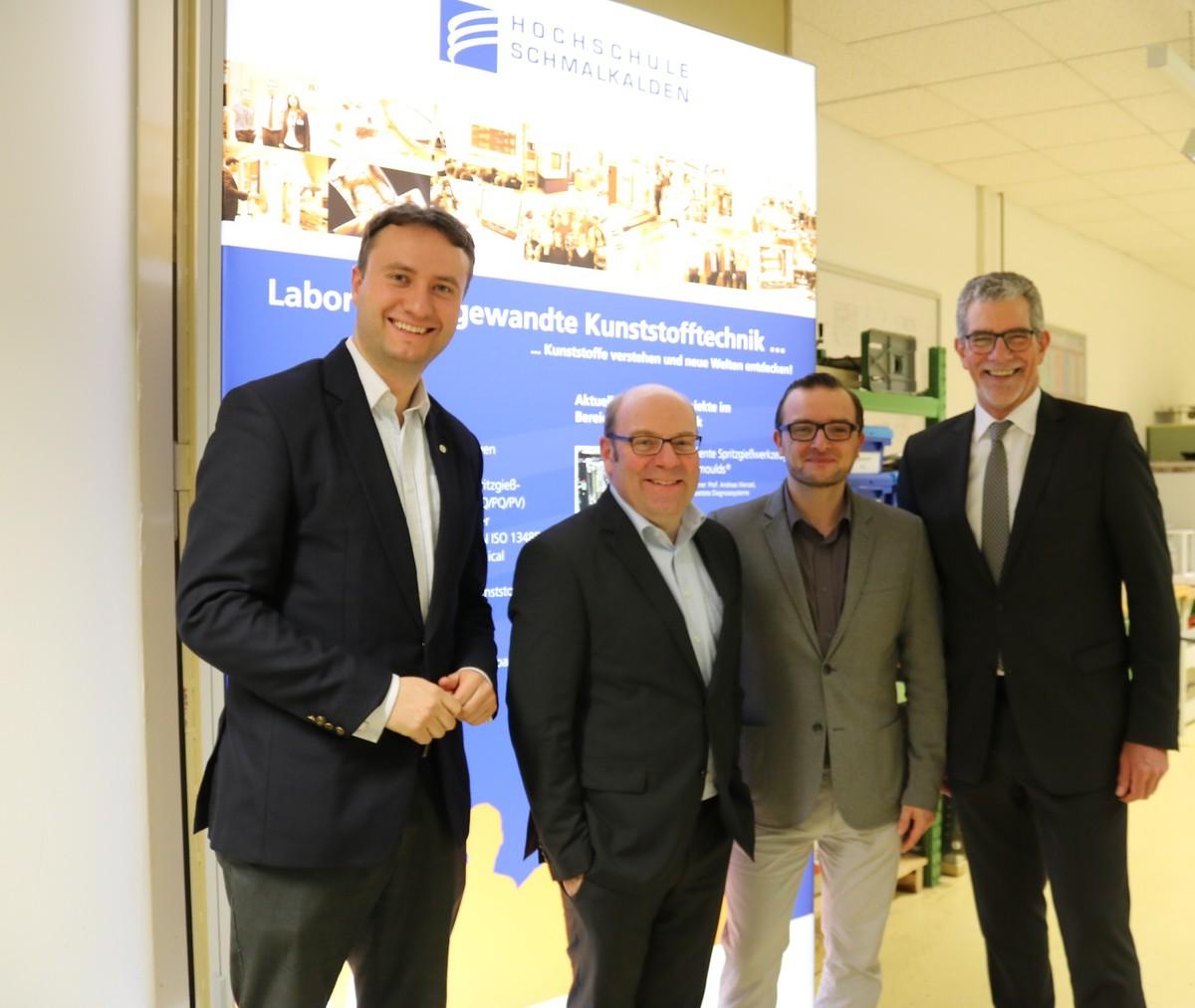 Die zweite Hälfte des Abends wurde in der Hochschule Schmalkalden fortgesetzt. Prof. Dr. Seul berichtete über die Herausforderungen für die Wissenschaft und Forschung in Zeiten der Industrie 4.0. Das Produkt müsse im Mittelpunkt stehen, so Seul. Anhand eines Getränkehalters für Autos demonstrierte Seul die fortführende Individualisierung von Produkten. Der vorgeführte Getränkehalter enthielt eine Thermoschicht, welche laut Seul auf dem chinesischen Absatzmarkt zu finden sei. Die Notwendigkeit für das Produkt ergebe sich aus den Essensgewohnheiten in China, die Suppen als festen Bestandteil von Mahlzeiten kennen und damit die Warmhaltefunktion erfordere. Am Beispiel des VW Golfs verdeutlicht Seul ferner den Prozess der Individualisierung und Variantenreichtums. Die Produktentwicklungszyklen werden immer kleiner und die Produktmenge sinkt, da für den Kunden unterschiedliche Modelle individuell angefertigt werden. Diese individuelle Anfertigung erhöht die Komplexität des Produktionsprozesses, da ein hohes Maß an Flexibilität und Präzision in der Fertigung gefordert wird. Entscheidende Faktoren beim Kauf eines jeglichen Produkts, seien mittlerweile nicht mehr nur Preis und Qualität (selbstverständlich), sondern Service und Zuverlässigkeit.