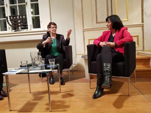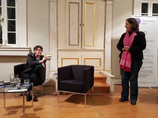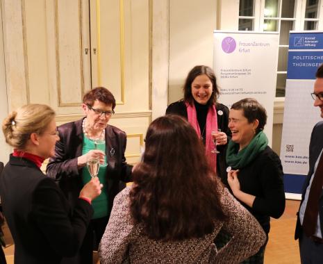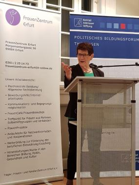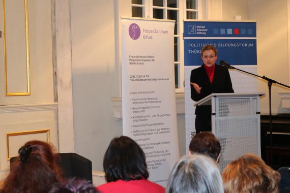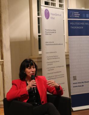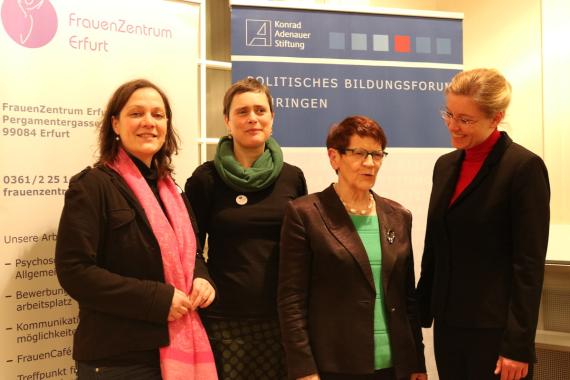 Am 21. Februar 2018 lud die Konrad-Adenauer-Stiftung in Kooperation mit dem FrauenZentrum Erfurt zum Thüringer Frauengesprächskreis ein, welcher diesmal unter dem Motto „MUT ZUR VERANTWORTUNG – IN DER POLITIK BRAUCHEN SIE GRUNDSÄTZE UND KOMPROMISSBEREITSCHAFT“ stand. Impulsgeberinnen des Abends waren Bundesministerin und Bundestagspräsidentin a.D. Prof. Dr. Rita Süssmuth sowie Marion Walsmann MdL, die mit der Moderatorin Britta Weck über die Rolle von Frauen in der Politik ins Gespräch kamen. Die Idee zu dieser Gesprächsrunde kam der Leiterin des FrauenZentrums, Christina Erdmenger, bereits vor etwa eineinhalb Jahren, als Rita Süssmuth in der Erfurter Volkshochschule referierte. Schon damals begeisterte die Professorin ihre Zuhörer. Das sollte sich wiederholen.