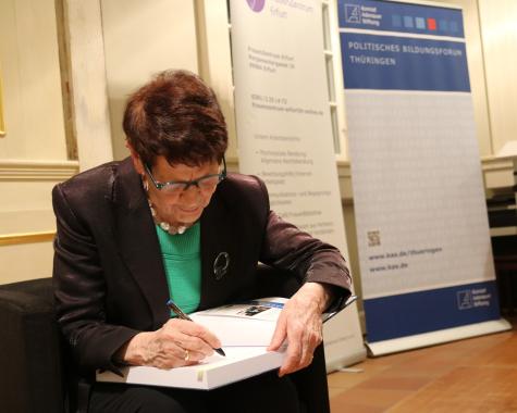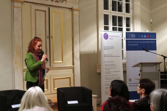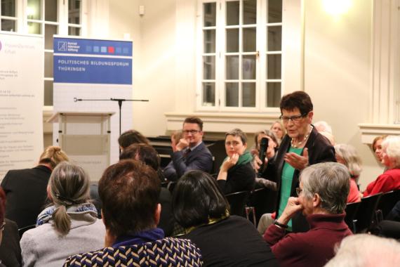 Nach der Begrüßung und Einleitung durch die Landesbeauftragte für Thüringen und Leiterin des politischen Bildungsforums Thüringen, Maja Eib, sprach Prof. Dr. Süssmuth zur Bedeutung gesellschaftspolitischen Engagements von Frauen für die Demokratie und unsere Gesellschaft. In ihrem Impulsreferat verstand es die Bundestagspräsidentin a.D. anhand von konkreten Beispielen die aktuelle Situation und Rolle der Frauen in Europa und der Welt, auch in der Politik, zu zeichnen. Bezugnehmend auf eine gerade stattgefundene Frauenkonferenz in Paris, entwarf Süssmuth so ein Bild der „festgefahrenen Politik“ und die Chance der Frauen, sich für ein Gewaltende in der Welt einzusetzen. Die von ihr zitierten Bücher von Stèphane Hessel: „Empört Euch“ und „Engagiert Euch“ veranschaulichen recht deutlich, dass ein Stehenbleiben für sie niemals in Frage kam und eher ein „Jetzt erst recht“ hervorrief. Frauen bewegen Themen anders als Männer. Nicht nur inhaltlich, sondern auch in der Umsetzung. Rückblickend auf persönliche Erfahrungen appellierte Rita Süssmuth daran das eigene Schicksal in die Hand zu nehmen und kämpferisch für eigene Ideen und Vorstellungen zum gesellschaftlichen Zusammenleben einzustehen. Allerdings betonte sie auch, dass man einen Personenkreis braucht, auf den man sich verlassen kann, denn „bestimmte Problemlösungen finden sich nur, indem man sich zusammenschließt und gemeinsam Dinge voranbringt.“