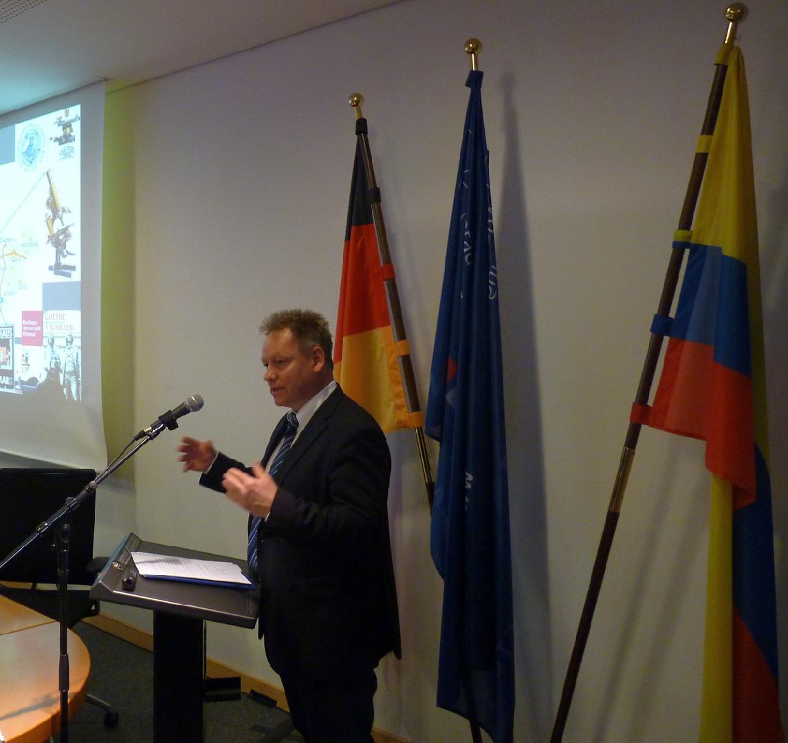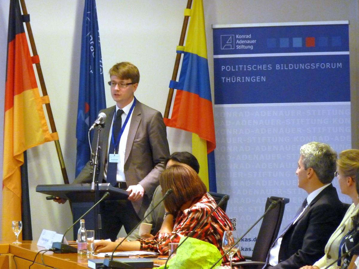 Lingenthal, Länderreferent Kolumbien im Lateinamerika-Team der Konrad-Adenauer-Stiftung, ermöglichte in seinem Vortrag einen Einblick in die Arbeit der Stiftung in und mit Kolumbien.