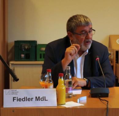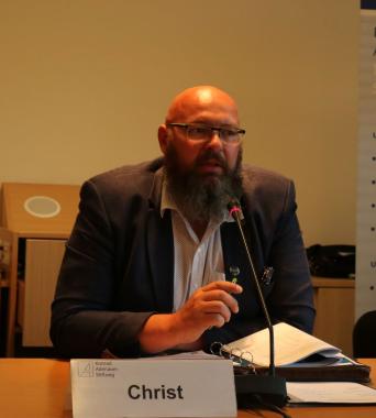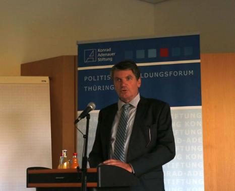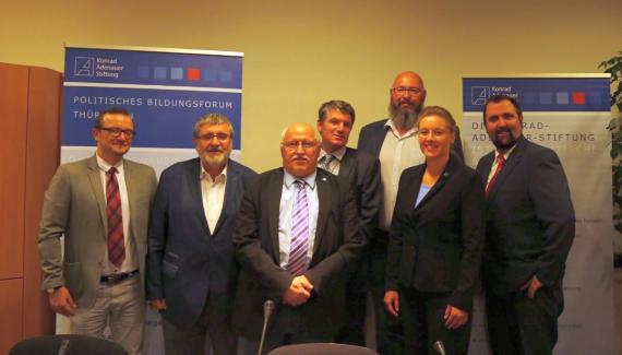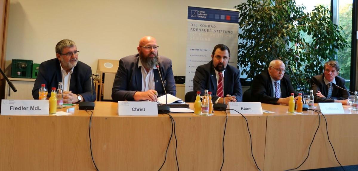 Vor diesem Hintergrund lud das Politische Bildungsforum der Konrad-Adenauer-Stiftung Thüringen am 18. September 2018 zum Expertengespräch im Thüringer Landtag mit folgenden Gästen: Dr. Rudolf van Hüllen, Politikwissenschaftler und Extremismusforscher, Wolfgang Fiedler MdL, Innenpolitischer Sprecher der CDU-Landtagsfraktion, Kai Christ, Landesvorsitzender Thüringen der Gewerkschaft der Polizei GdP und Jürgen Hoffmann, Landesvorsitzender Thüringen der Deutschen Polizeigewerkschaft DPolG. Die Diskussion wurde moderiert von Fabian Klaus (TLZ). Leiterin des Politischen Bildungsforums der Konrad-Adenauer-Stiftung Thüringen Maja Eib illustrierte in ihrer Begrüßungsrede alltägliche und öffentliche Ablehnung des Gewaltmonopol des Staates anhand einer umfangreichen Fotodokumentation des Schriftzuges „ACAB“ (engl.: „all cops are bastards“, deutsch: „Alle Polizisten sind Bastarde“) in Erfurt und Liedtexte der erst kürzlich beim Konzert „Wir sind mehr“ in Chemnitz am 03. September 2018 aufgetretenen Band „Feine Sahne Fischfilet“. Frau Eib monierte, dass die ACAB-Schmierereien von der Politik nicht beachtet und im Vergleich zu anderer Hetze auch nicht entfernt würden. Diese Nichtbeachtung der Politik wiederum auch mit dem Anstieg beim Widerstand gegen Polizeivollstreckungsbeamte einher, der in den Jahren 2015-2016 in Thüringen 20,3% betrug.
