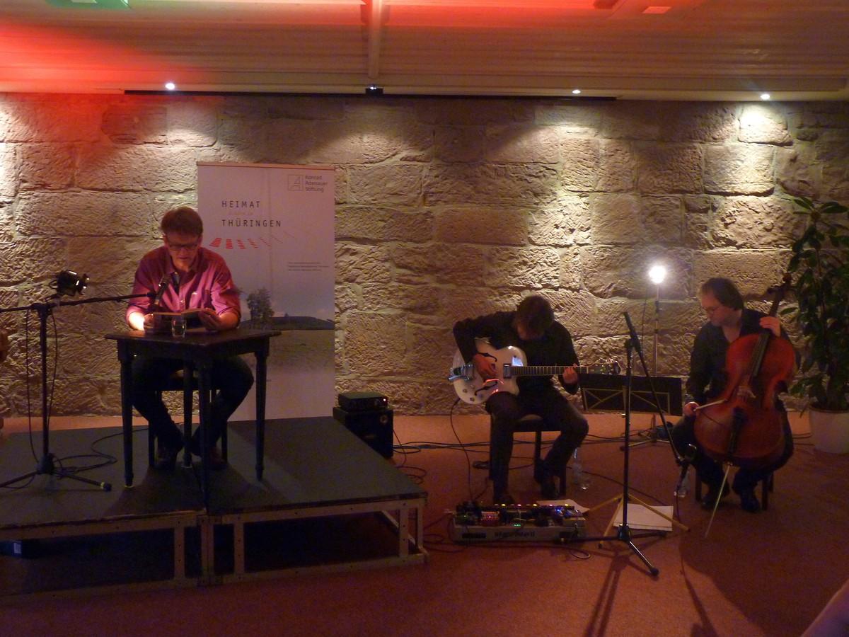In einer durch das Zusammentreffen von Lesung und Musik kreierten intensiven Atmosphäre hörten die Anwesenden gespannt den Erzählungen von Eric-Emmanuel Schmitt zu. Es las Lutz Großmann vom Puppentheater Gera/Theater&Philharmonie Thüringen. Die musikalische Gestaltung mittels E-Gitarre und Cello übernahm das Duett Dreyer von Freiraum Syndikat. Neben Stücken von Sting und anderen internationalen Musikern, spielten sie eigens vom Bandleader Lukas Dreyer komponierte Stücke.