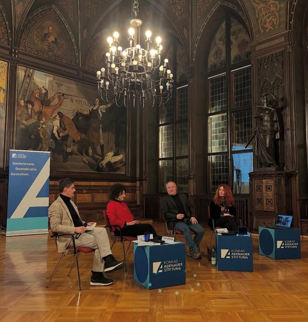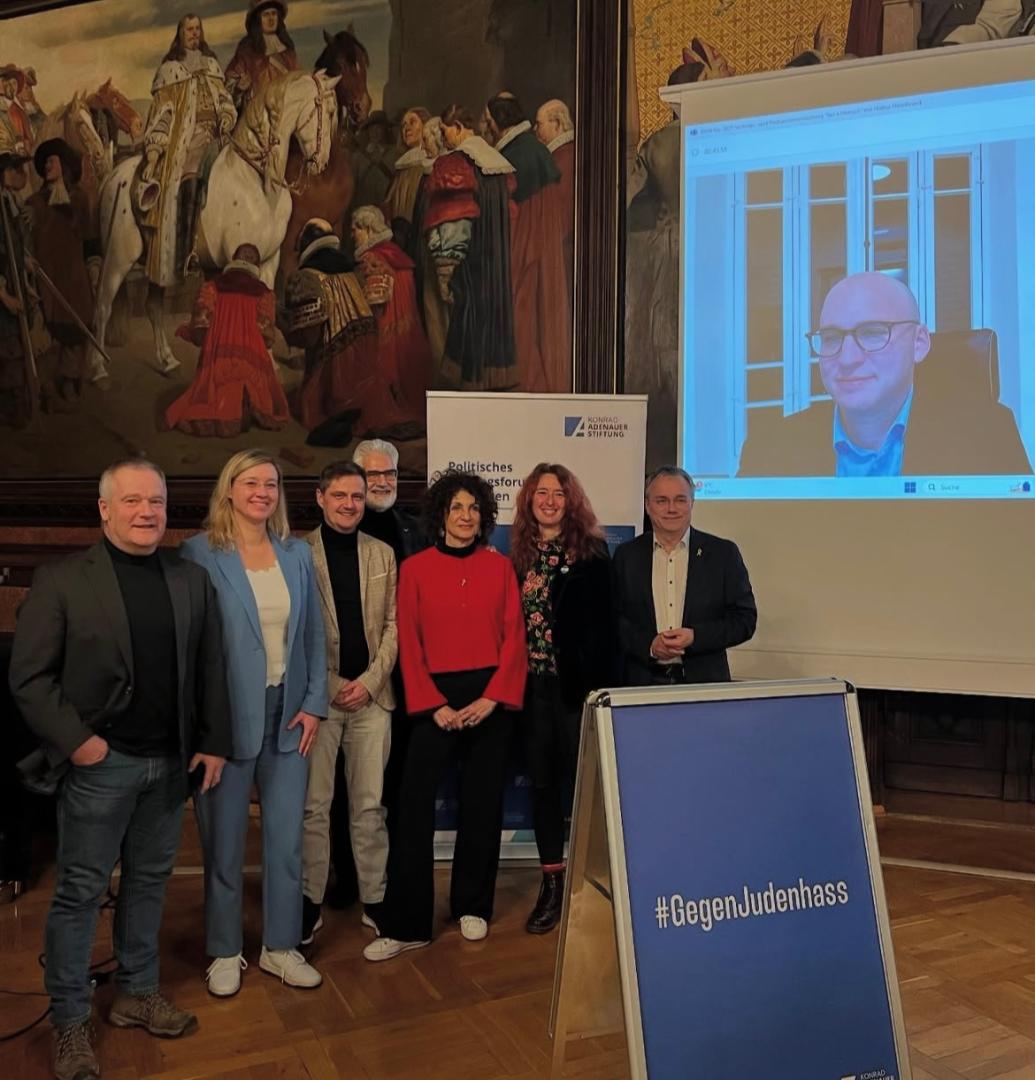 Maja Eib, Leiterin des Politischen Bildungsforums Thüringen der KAS, eröffnete die Veranstaltung mit einer Gedenkminute für die Familien der Opfer des Massakers durch die Terrororganisation Hamas vom 7. Oktober 2023 und die im jüngsten Gefangenenaustausch tot ausgelieferten Geiseln. Die Veranstaltung fand einen Tag nach dem 27. Januar statt – einem Datum, das in der Bundesrepublik Deutschland seit 1996 als Tag des Gedenkens an die Opfer des Nationalsozialismus begangen wird. Die Konrad-Adenauer-Stiftung lädt rund um diesen Tag zum DenkTag ein, der ein starkes Zeichen gegen jegliche Art von Extremismus und Antisemitismus mit Veranstaltungen, an neben Zeit- und Zweitzeugen auch Wissenschaftlern, Journalisten und Fotografen teilnehmen, die sich in ihren Arbeiten aktiv mit der Geschichte und aktuellen gesellschaftspolitischen Veränderungen beschäftigen. Der DenkTag 2025 statt unter dem Fokus sich insbesondere den israelbezogener Antisemitismus in Europa und Deutschland anzusehen und das Leid in Israel in den Blick zu nehmen.