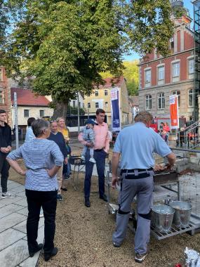 Vor dem Rathaus wurden währenddessen von ehrenamtlichen Feuerwehrmännern Bratwürste für die Gäste vorbereitet. Die Teilnehmenden genossen das Essen und kamen nebenbei miteinander ins Gespräch und tauschen sich über aktuell bewegende Themen aus, wie zum Beispiel die Integration ukrainischer Schüler in deutsche Klassen oder aber auch die große Herausforderung Desinformationen und Fake-News zu erkennen. Und so ging der Tag der Demokratie in Thüringen langsam zu Ende: mit gutem Essen, vielen Begegnungen und anregenden Gesprächen.