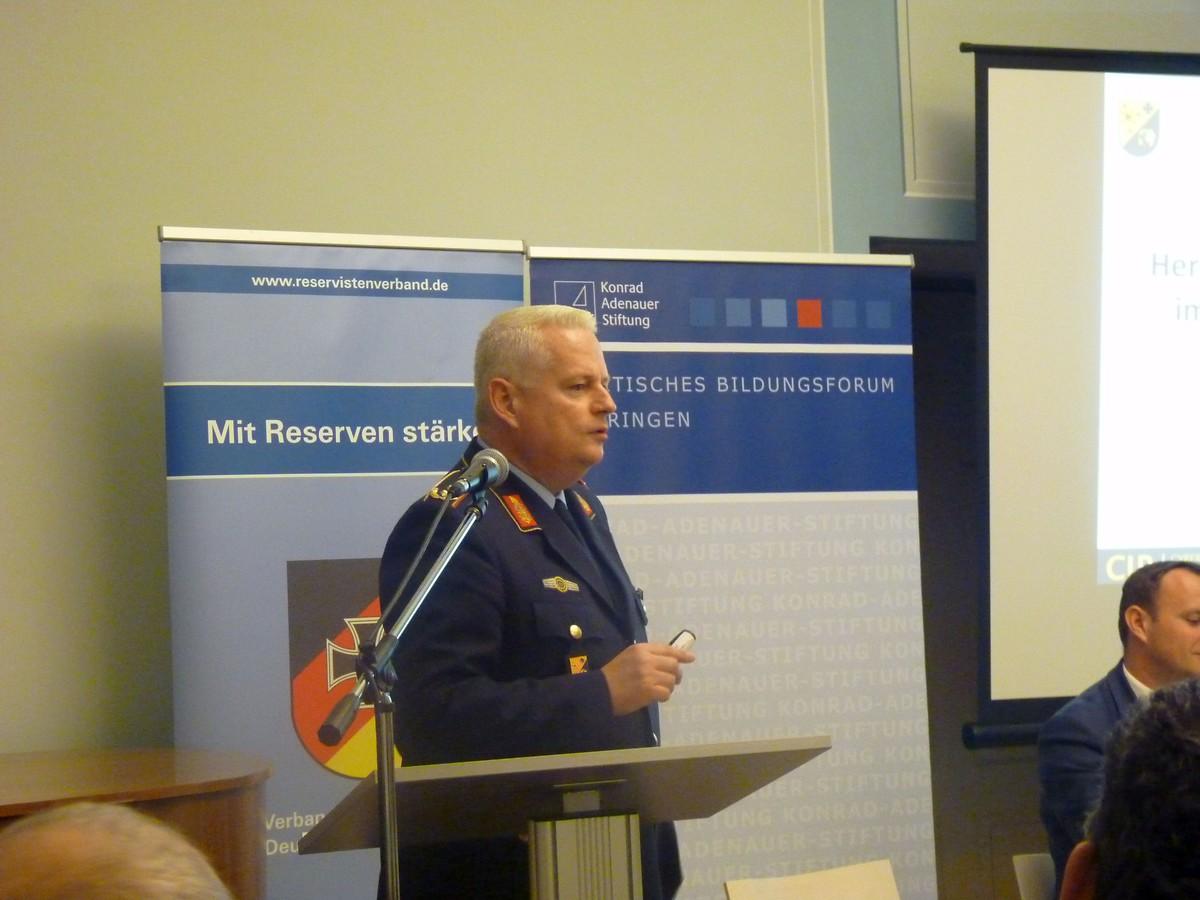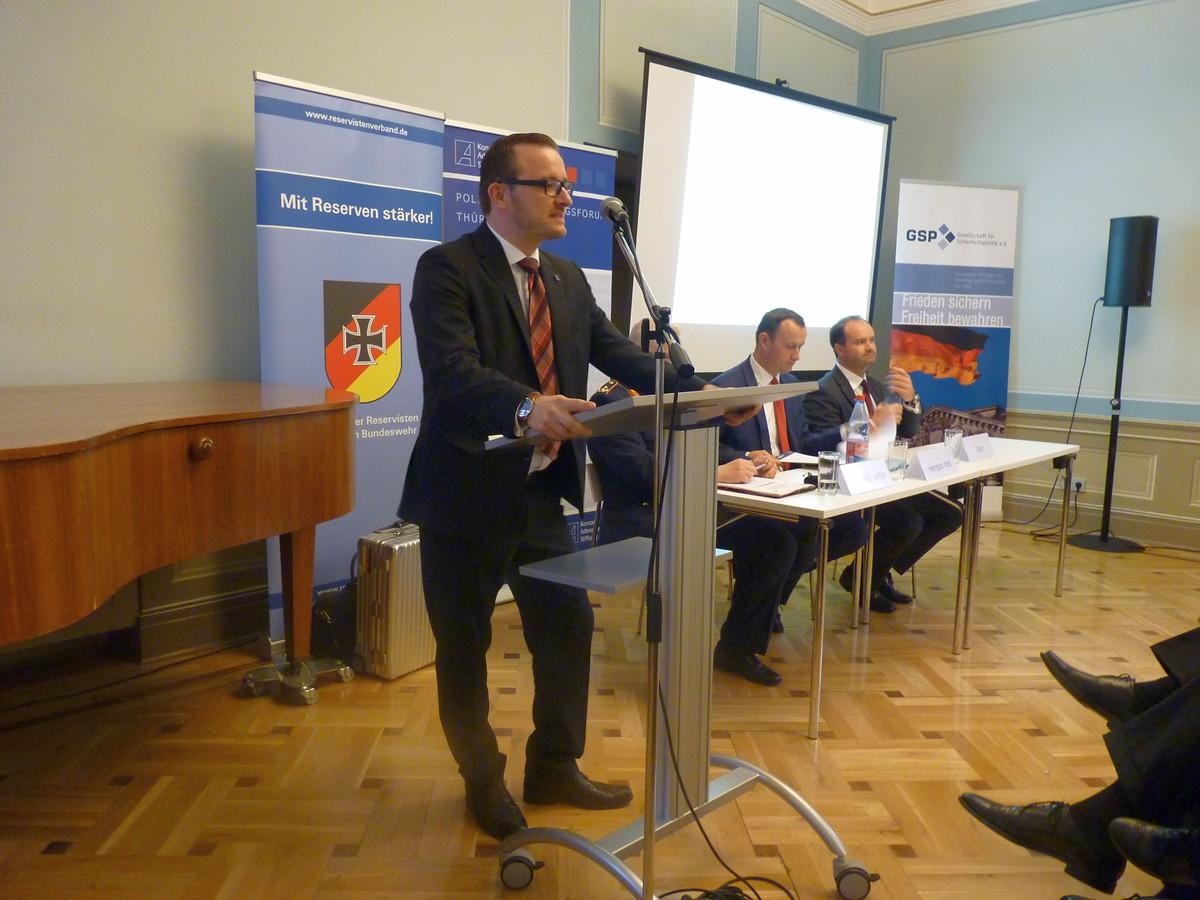 Zunächst begrüßte Herr Daniel Braun, wissenschaftlicher Mitarbeiter des Politischen Bildungsforums Thüringen der Konrad Adenauer Stiftung, die Gäste und die Referenten. In seinen einleitenden Worten beschrieb Braun die aktuelle Lage und Herausforderungen des digitalen Zeitalters. Danach begrüßte Christian Fromm, Landesgeschäftsführer Thüringen, Verband der Reservisten der Deutschen Bundeswehr e.V. die Gäste.