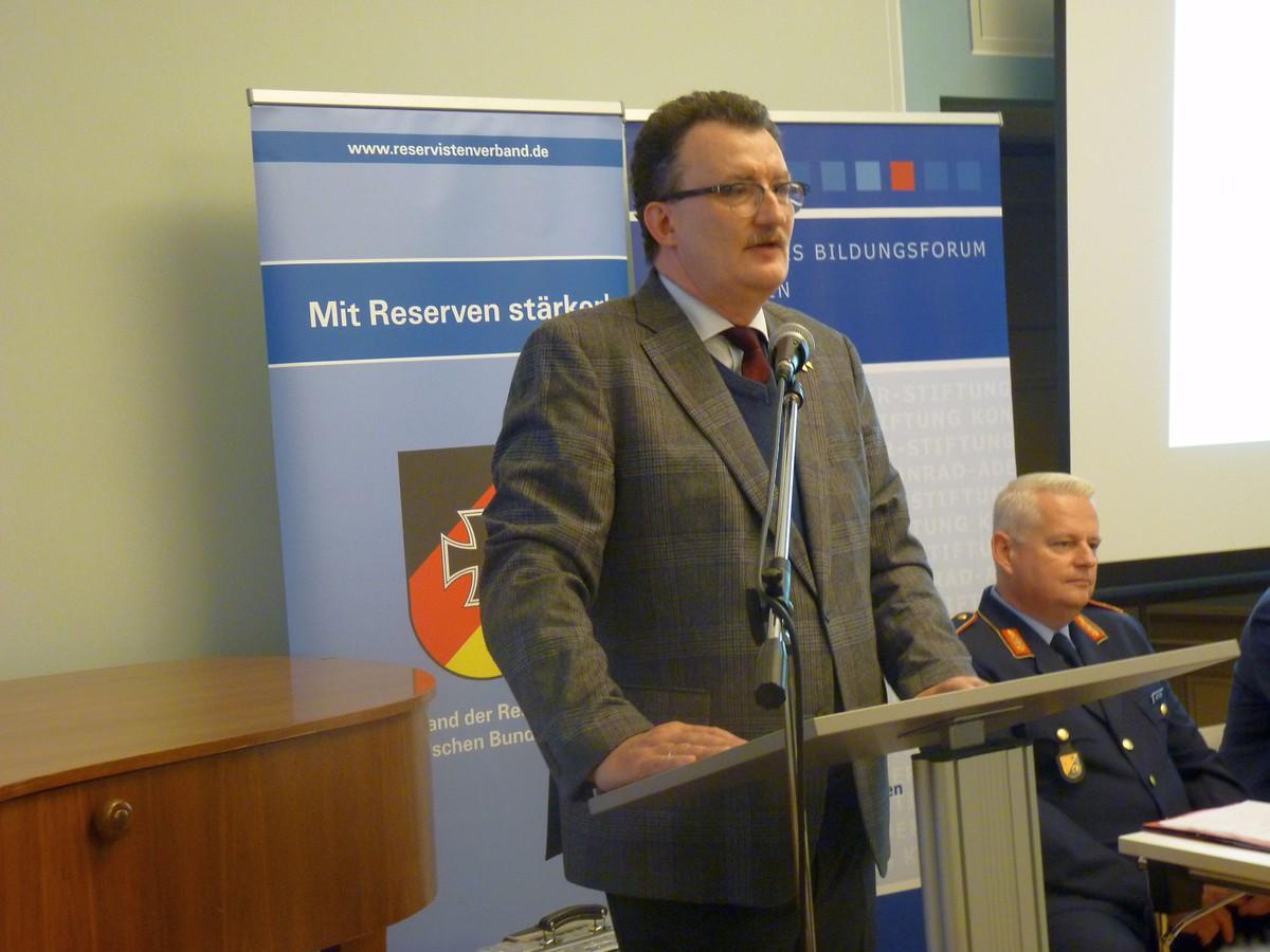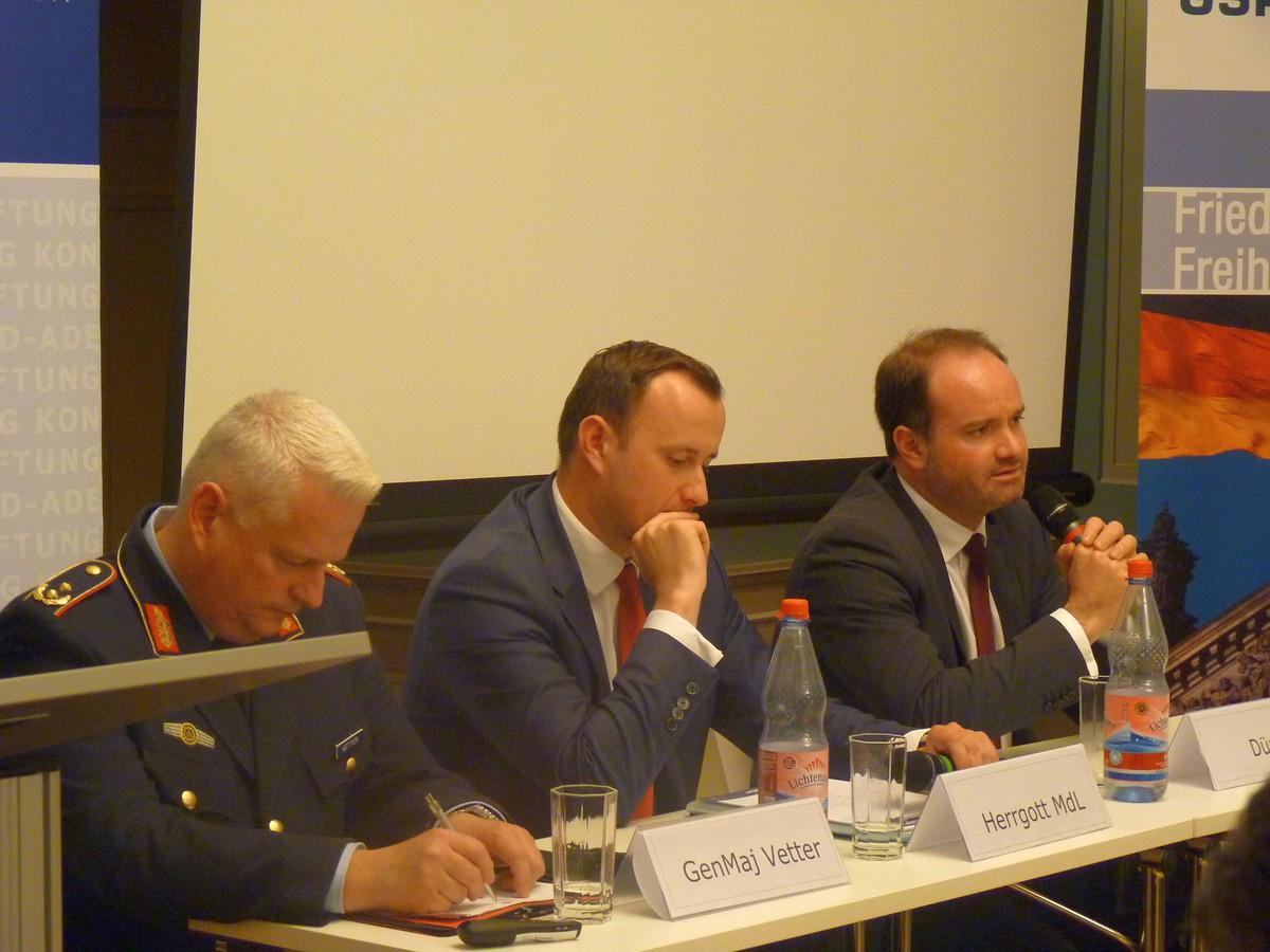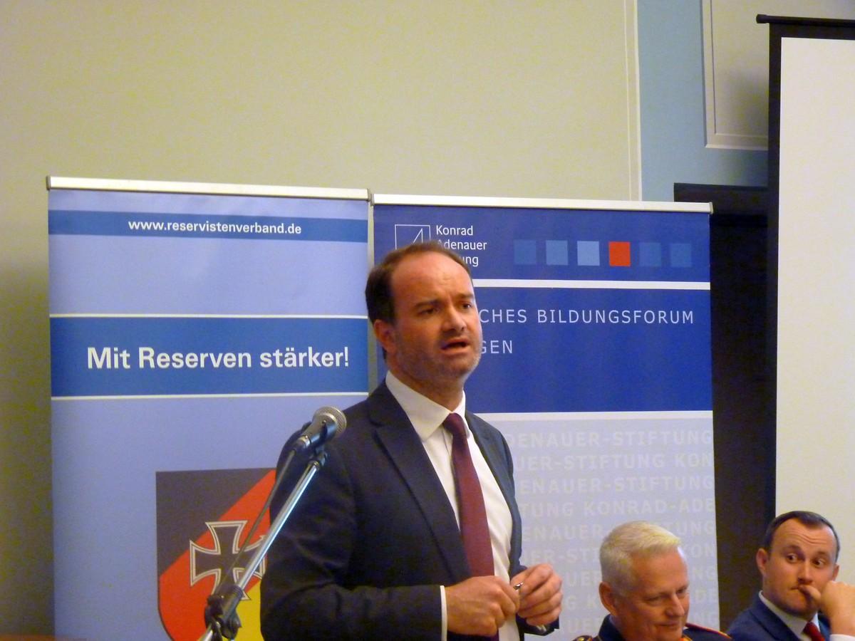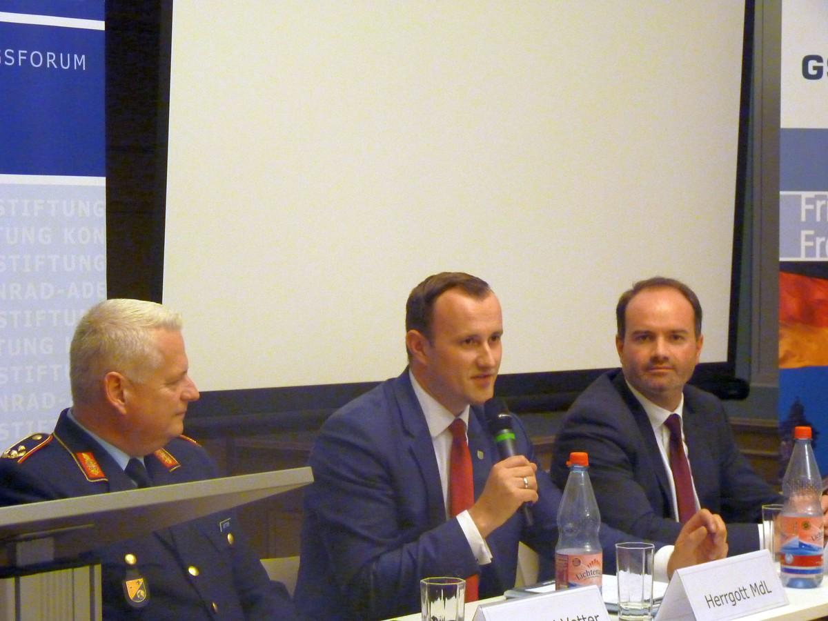 Im Anschluss übernahm der Moderator Christian Herrgott MdL, Reservist und ehemaliger Bundeswehr-Offizier, Beauftragter der CDU-Landtagsfraktion für die Bundeswehr das Wort und führte in die Diskussion und Fragerunde ein.