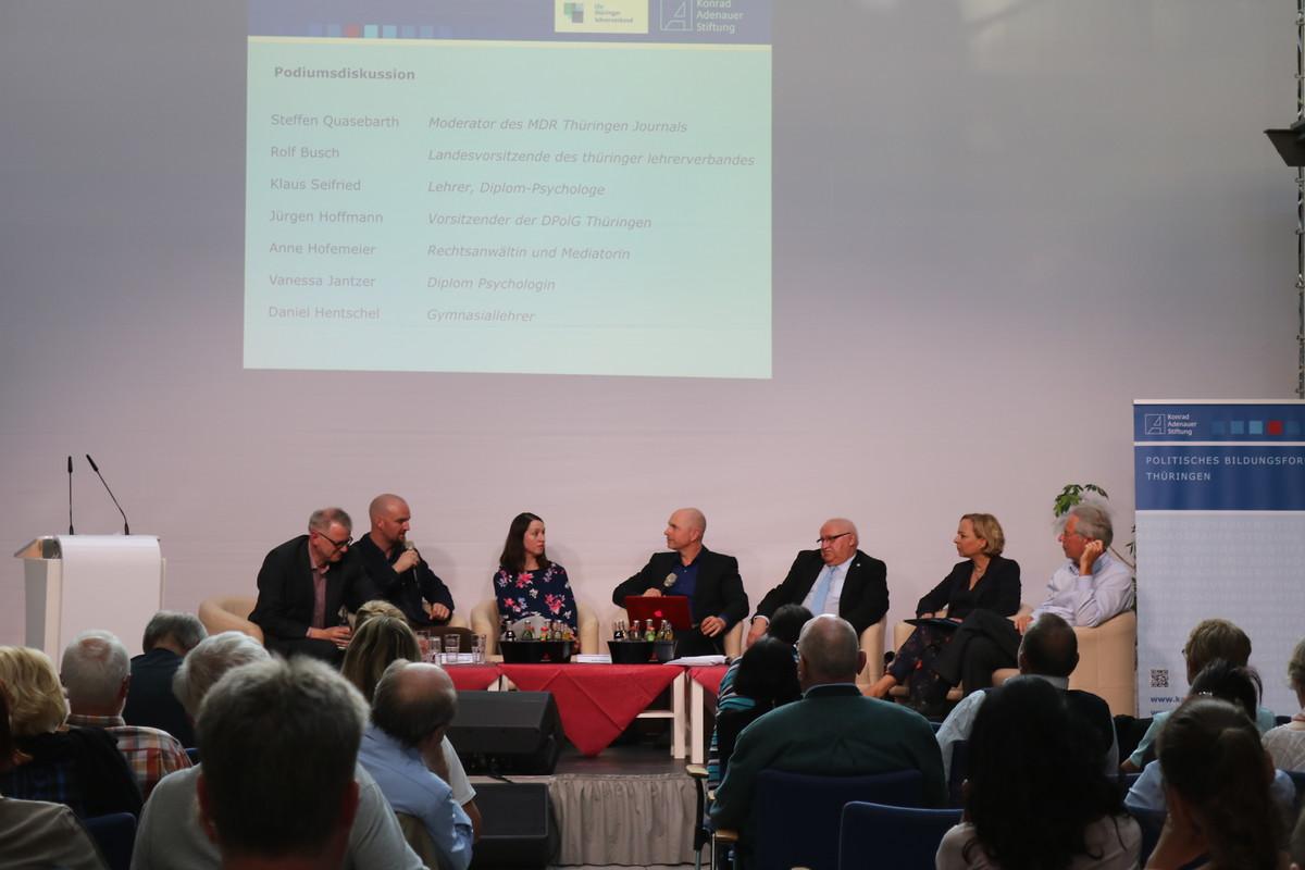 Unter der Moderation von Steffen Quasebarth, Moderator des mdr Thüringen Journals und Trainer für Gewaltfreie Kommunikation, wurde anschließend gemeinsam über weitere Fragen diskutiert und tiefer in die Materie eingedrungen. Im Fokus stand unter anderem die Langwierigkeit juristischer als auch schulischer Maßnahmen. Um eine schulische Maßnahme, beispielsweise den Ausschluss eines Schülers am Unterricht zu bewilligen, bedarf es der Zustimmung des Schulrats. Allerdings erfordert dieser Antrag Zeit. Genauso sieht es mit juristischen Maßnahmen aus. Problem dabei ist, dass die Lehrer am kommenden Tag ihrem Peiniger gegenübertreten müssen und diesen weiterhin unterrichten müssen. Ferner wurden aus dem Publikum die Stimmen laut, dass schulische Maßnahmen kaum eine abschreckende Wirkung hätten. Die Schüler würden einen Wettbewerb daraus veranstalten, wer die meisten Strafmaßnahmen bekommen hat und freuen sich darüber, wenn sie vom Unterricht suspendiert werden. Die Zusammenarbeit mit den Jugendämtern und die Erreichbarkeit des Schulpsychologischen Dienstes wurden als mangelhaft beschrieben. Der Schulpsychologische Dienst ist schlecht erreichbar und die Zusammenarbeit mit dem Jugendamt funktioniere häufig nur in eine Richtung – von der Schule zum Jugendamt, so eine Stimme aus dem Publikum.