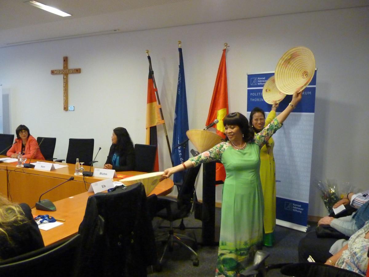 Nach einen einführenden Tanz mit Kegelhüten, Fächern und traditionaler Tracht von vietnamesischen Frauen begrüßte Maja Eib, Landesbeauftragte der Konrad-Adenauer-Stiftung e.V. für den Freistaat Thüringen, die Gäste. In ihrer Begrüßung erwähnte sie die gelungene Geschichte der in den 80er Jahren als Vertragsarbeiter nach Deutschland angekommenen Vietnamesen. In diesem Zusammenhang sollte der gelungene Integrationsprozess der Vietnamesen trotz Herausforderungen und Schwierigkeiten als Beispiel gesehen werden, wie erfolgreiches Ankommen auch in der 2. Und 3. Generation in Deutschland funktionieren kann. Auch für die Vietnamesen war das Ankommen nicht leicht. Neben den kulturellen Unterschieden erschwerte das SED-Regime die Integration. Die DDR war hauptsächlich an der Arbeitskraft interessiert und Kontakte zwischen DDR-Bevölkerung und Vietnamesen waren abseits offizieller Kanäle kaum möglich bzw. nicht erwünscht, so dass erst nach der Wiedervereinigung und der Konsolidierung der Aufenthaltsregelungen eine wirkliche Zukunft in Deutschland aufgebaut werden konnte, die wir heute selbstverständlich in unseren vietnamesischen Nachbarn in Thüringen sehen.