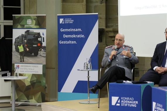 Am 12. November 2025 fand im Collegium Maius in Erfurt eine Kooperationsveranstaltung der Konrad-Adenauer-Stiftung Thüringen mit dem Landeskommando Thüringen der Bundeswehr statt. Das Jahr 2025 ist ein besonderes Jahr: Die Bundeswehr feiert ihr 70-jähriges Bestehen. Ihre Gründung und Deutschlands Beitritt zur NATO 1955 sind entscheidende Wegmarken der deutschen Geschichte. Denn nur zehn Jahre nach den Schrecken des Zweiten Weltkrieges bewaffnete Deutschland sich wieder. Doch mit der neu aufgestellten Bundeswehr entstand eine ganz andere Armee, als es die Wehrmacht des Dritten Reiches war – im Geist der Demokratie erzogen und eingebunden in die NATO.