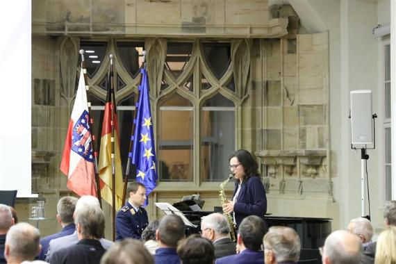Die Landesbeauftragte und Leiterin des Politisches Bildungsforums Thüringen Maja Eib machte in ihrer Begrüßung deutlich, dass sieben Jahrzehnte Dienst und Einsatz der Bundeswehr ohne Schlüsselereignisse wie Westbindung, den NATO-Beitritt und die deutsche Wiedervereinigung nicht vorstellbar sind. Sie machte deutlich, dass die Arbeit der Streitkräfte in eine wehrhafte Demokratie eingebettet ist.