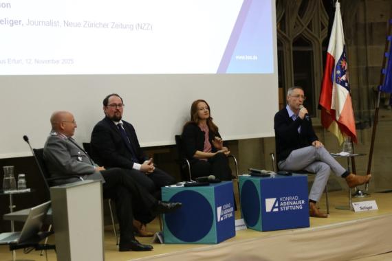 Am 12. November 2025 würdigten die Konrad-Adenauer-Stiftung Thüringen und das Landeskommando Thüringen im Collegium Maius Erfurt das 70-jährige Bestehen der Bundeswehr. Nach Grußworten von Maja Eib und Oberst Klaus Glaab betonte Landtagspräsident Dr. Thadäus König die Rolle der Streitkräfte als „Armee der Demokratie“ und Garant für Sicherheit, Hilfe und Abschreckung. In einer Podiumsdiskussion mit Expertinnen und Experten standen aktuelle sicherheitspolitische Herausforderungen, NATO-Verantwortung und kognitive Resilienz im Fokus. Ein festlicher Empfang rundete den Abend ab.