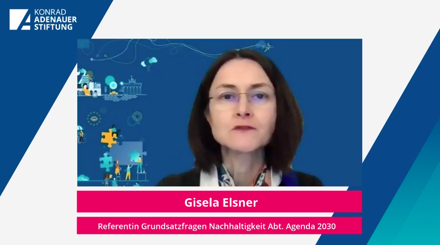 Die Voraussetzungen, die Agenda 2030 umzusetzen, seien nicht schlecht, erläuterte Elsner. Auch in der Wirtschaft könne man einen Wechsel erkennen. Ein Perspektivwechsel hin auf die Verantwortung und weg von der Problembetonung könne wichtige neue Impulse setzen, argumentierte Elsner. Auch aus der COVID-19-Pandemie könne man lernen, das Thema Nachhaltigkeit neu zu denken. Gemeinsam können Politik, Wirtschaft und Zivilgesellschaft dafür wichtige Beiträge leisten.