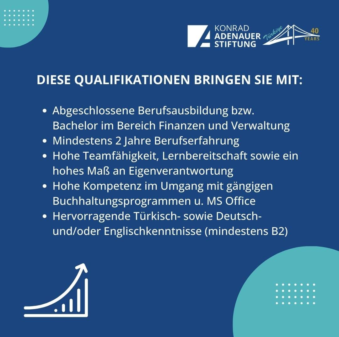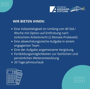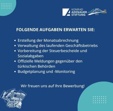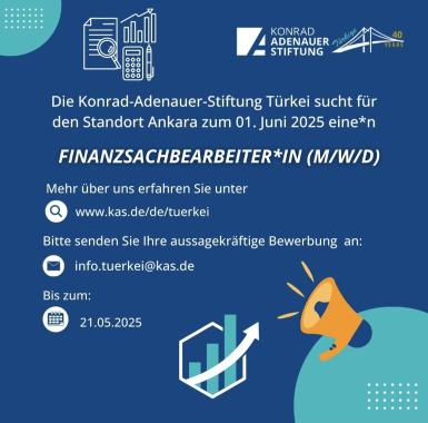 Die Konrad-Adenauer-Stiftung Türkei sucht für den Standort Ankara zum 01. Juni 2025 eine*n Finanzsachbearbeiter*in (m/w/d).