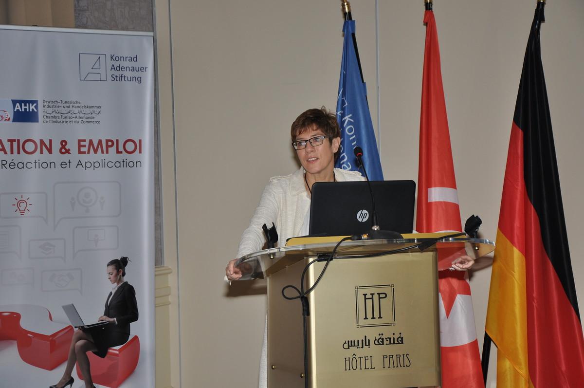 Im Rahmen der von der Konrad-Adenauer-Stiftung, dem tunesischen Jungunternehmerverband CJD und der Deutsch-Tunesischen Handelskammer durchgeführten Konferenz hielt die saarländische Regierungschefin eine Grundsatzrede zur „Beruflichen Bildung vor der Herausforderung der Internationalisierung“. Dabei unterstrich Kramp-Karrenbauer die sich in Deutschland wie Tunesien gleichermaßen stellende dringende Nachfrage nach qualifizierten Handwerkern. Politik wie Privatwirtschaft müßten vor diese Herausforderung gestellt dafür Sorge tragen, das Handwerk wie die berufliche Bildung angesichts der Akademisierung als eine zukunftsträchtige und lohnende Alternative darzustellen. Mit Blick auf das Saarland stellte die Ministerpräsidentin die im Sommer diesen Jahres verabschiedete Internationalisierungsstrategie hervor, deren tragende Pfeiler u.a. auch Projekte der gemeinsamen deutsch-französischen Berufsausbildung darstellten. Das Saarland als ehemals ohnehin frankophones Land hat im Rahmen dieser Strategie beschlossen, die französische Sprache innerhalb einer Generation wieder zur zweiten Verkehrssprache zu machen. Daraus ergeben sich, so Kramp-Karrenbauer, für die intra-regionale wie internationale Zusammenarbeit entscheidende Impulse, die Wirtschaft und Politik nutzen wollten.