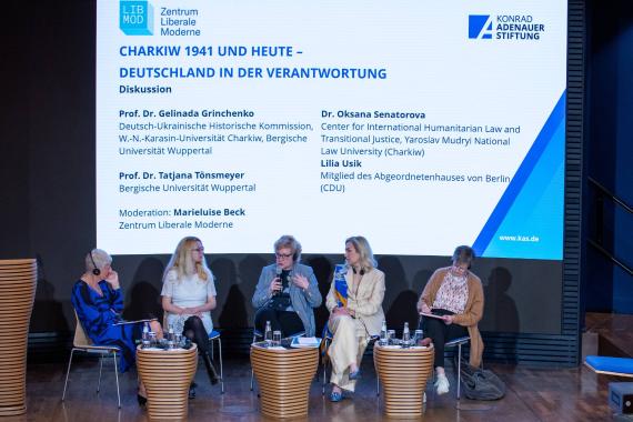 Am 15. Mai 2023 fand eine gemeinsame Veranstaltung der KAS Charkiw und des Zentrums Liberale Moderne „Charkiw 1941 und heute – Deutschland in der Verantwortung“ in Berlin statt. Sie brachte Historikerinnen, eine Juristin sowie Politikerinnen zusammen zu einer Diskussion über die nationalsozialistische Besatzung der Ukraine im Zweiten Weltkrieg und die gegenwärtige russische Besatzung. Welche Rolle spielt und welche Verantwortung trägt Deutschland?