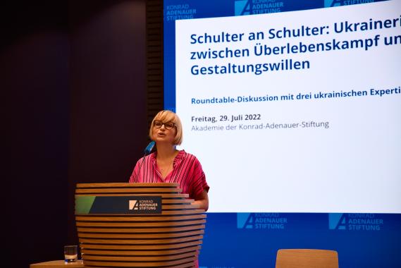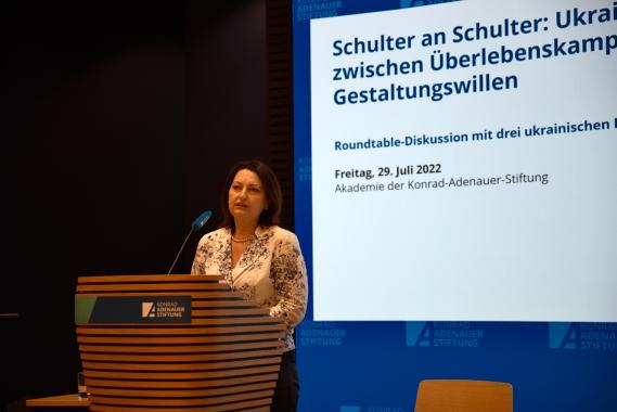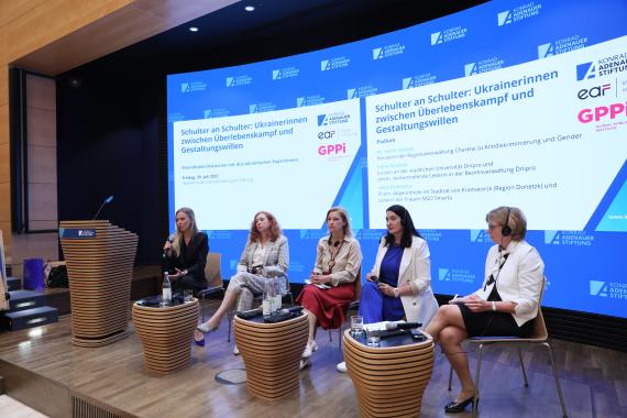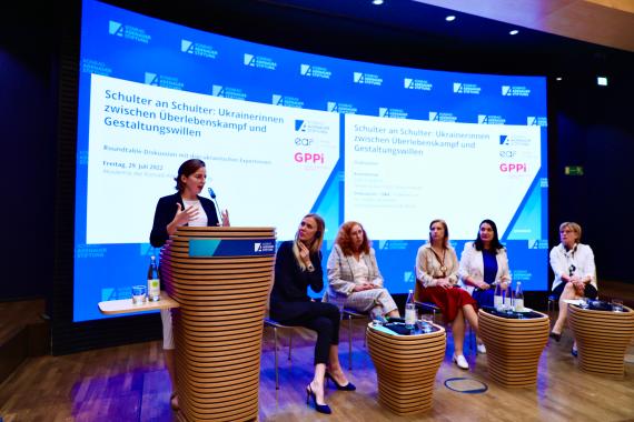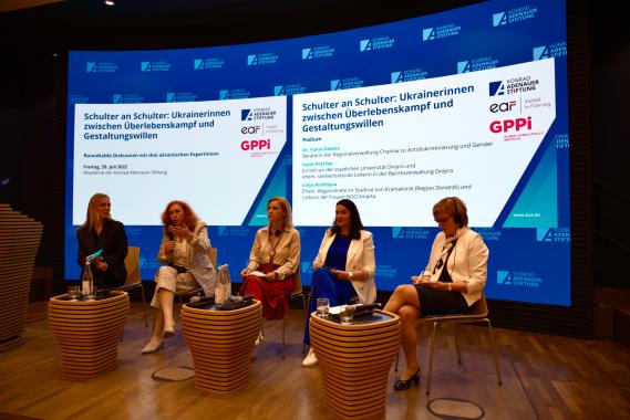 Am 29. Juli 2022 organisierte die Konrad-Adenauer-Stiftung in der Ukraine, EAF Berlin und GPPI gemeinsam eine Roundtable-Diskussion mit 4 ukrainischen Expertinnen zum Thema „Schulter an Schulter: Ukrainerinnen zwischen Überlebenskampf und Gestaltungswillen“. Die Veranstaltung fand in Berlin in der Akademie der Konrad-Adenauer-Stiftung unter Teilnahme deutscher Stakeholders, Experten und Expertinnen und Journalisten und Journalistinnen statt.