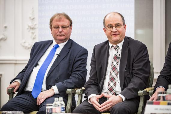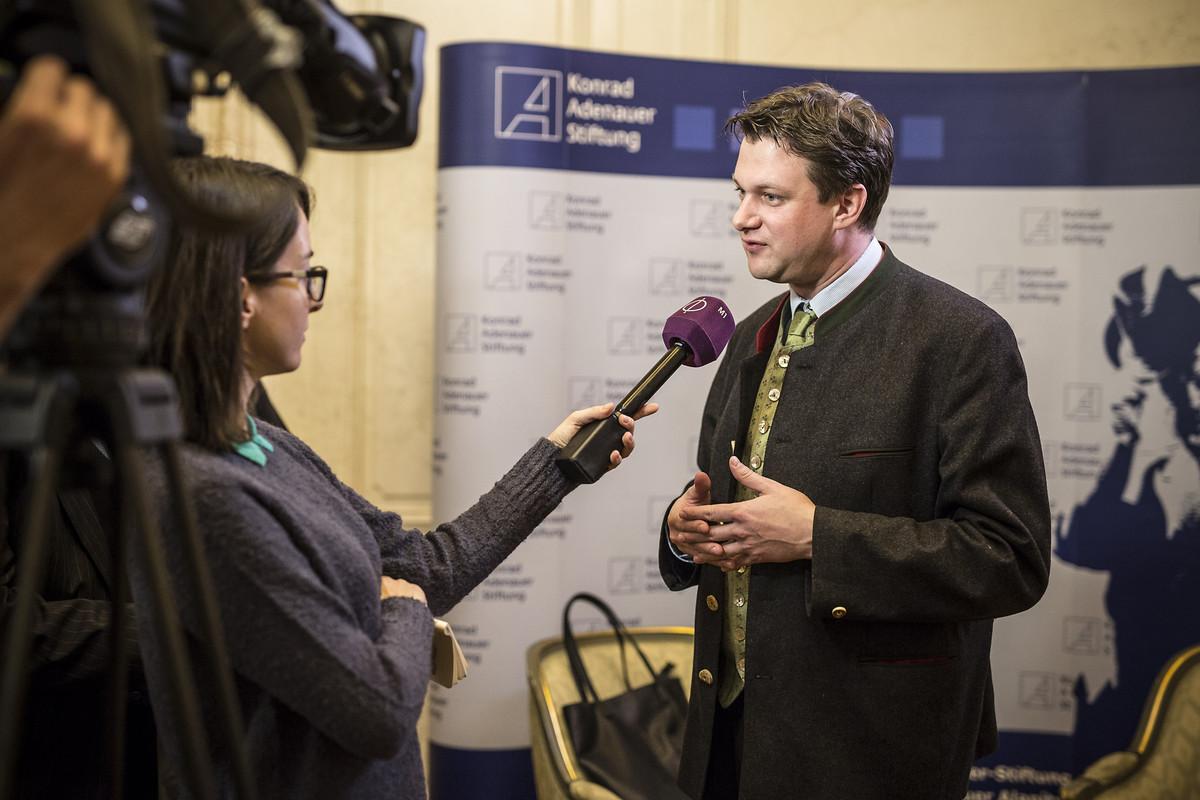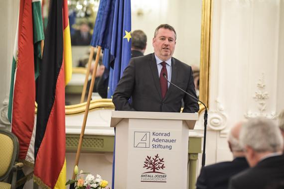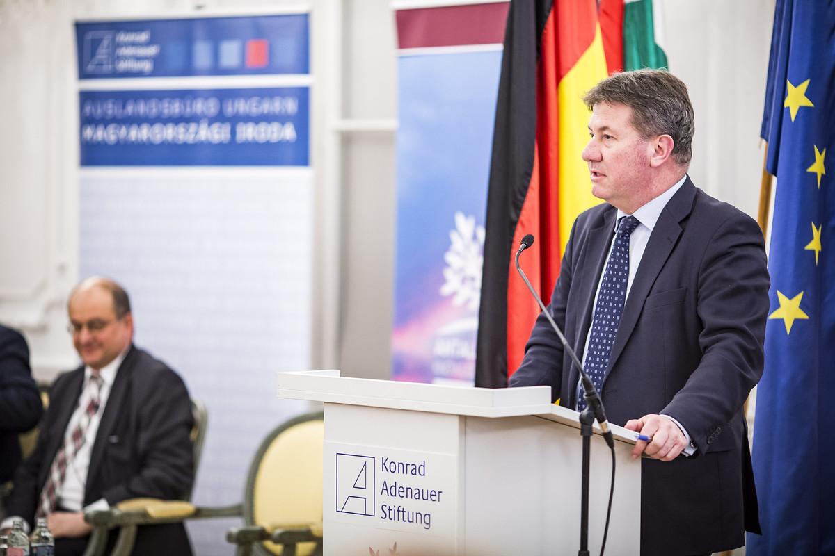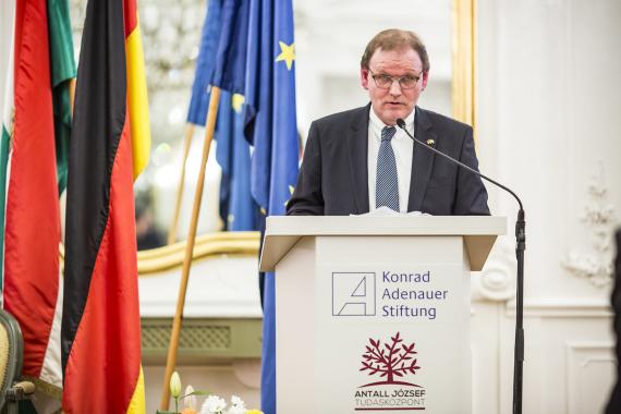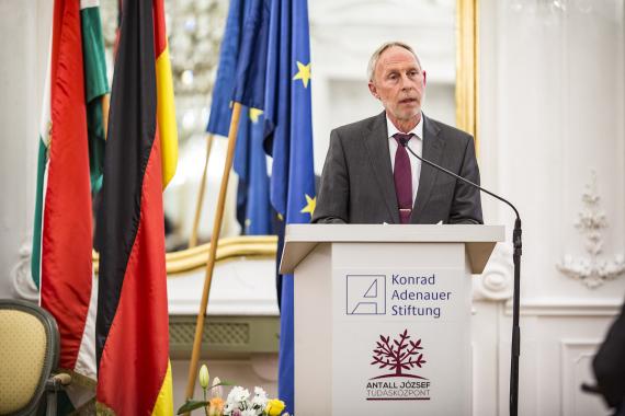 Ádám Kégler, stellv. Direktor des Antall József Wissenszentrums und Frank Spengler, Leiter des Auslandsbüros Ungarn der Konrad-Adenauer-Stiftung, gingen in ihrer Begrüßung auf die traditionsreichen Beziehungen beider Länder ein, die nach Beendigung des Kalten Krieges auf der Grundlage gemeinsamer Werte und Interessen neu belebt wurden.