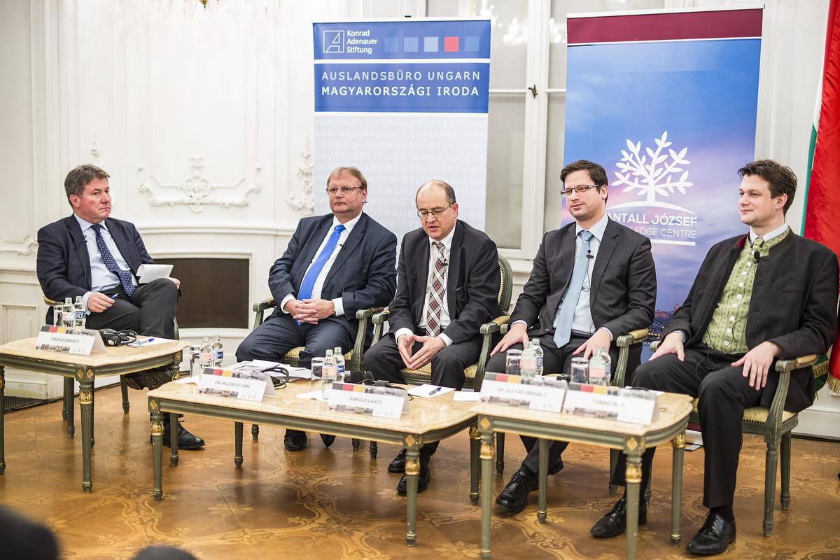 Die im Anschluss stattfindende Podiumsdiskussion wurde von Gergely Prőhle, Direktor des Petöfi Literaturmuseums, moderiert. Teilnehmer waren: die beiden Bundestagsabgeordneten Arnold Vaatz (CDU), stellv. Vorsitzender der CDU/CSU-Bundestagsfraktion und Tobias Zech (CSU) sowie die beiden stellv. Vorsitzenden der Ungarischen Nationalversammlung Dr. Gergely Gulyás (Fidesz) und Dr. István Hiller (MSZP). Vaatz mahnte an, dass es wichtig sei, auf das geänderte Wahlverhalten mit mehr Realismus zu reagieren. Zech wies auf die wichtige Rolle der Europäischen Union bei der Sicherstellung der längsten Friedensperiode des Kontinents hin. Um diese weiter gewährleisten zu können, bedürfe es gemeinsamer europäischer Antworten, solidarischer Zusammenarbeit und eines umfassenden gesellschaftspolitischen Dialogs. Gulyás bezeichnete die Zeit seit der Unterzeichnung des deutsch-ungarischen Freundschaftsvertrags als eine erfolgreiche Periode, die im 21. Jahrhundert durch gegenseitiges Verständnis und Toleranz aufrechterhalten werden müsse. Der Freundschaftsvertrag sei ein Meilenstein in der Geschichte der beiden Nationen, so Hiller, der die ungarische Position in der europäischen Staatengemeinschaft nachhaltig geprägt habe. Es herrsche Einvernehmen darüber, dass die EU nur durch erfolgreiche Mitgliedsstaaten stabilisiert werden könne.