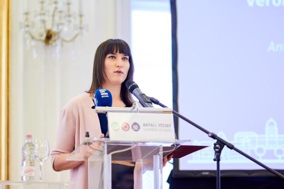 „Das Ziel der Antall József Sommerschule ist die Begabtenförderung, die Sicherung der Möglichkeiten einer weiteren Fortbildung und persönlichen Entwicklung von jungen Menschen” – betonte Veronika Antall-Horváth, die stellv. Direktorin des Wissenszentrums in ihrermEröffnungsbeitrag. „Wir möchten ein eindeutiges Bild über die V4-Zusammenarbeit aufzeigen und die auftauchenden Zweifel klären. Die Vielfalt der teilnehmenden Studierenden zeigt, dass das Interesse an der Region immer größer wird“, so die stellv. Direktorin.