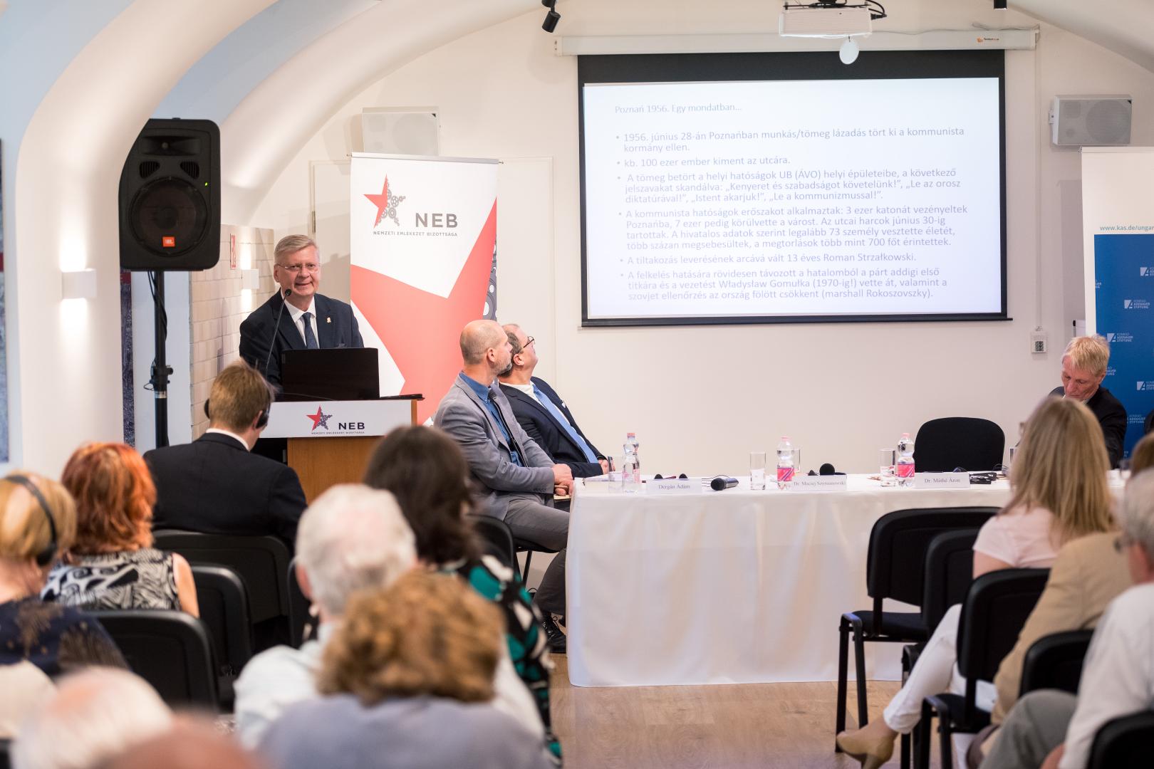Im zweiten Themenblock erläuterten Dr. Maciej Szymanowski, Vorsitzender des Wacław Felczak Instituts für Polnisch-Ungarische Zusammenarbeit, sowie Dr. Áron Máthé, stellv. Vorsitzender des Nationalen Gedenkkomitees die jeweiligen Ereignisse in Polen und Ungarn sowie die jeweilige Rezeption im anderen Land. Dr. Szymanowski thematisierte die Ereignisse in Posen und betonte zudem den hohen Stellenwert des Ungarischen Volksaufstandes von 1956 im polnischen Gedächtnis und verglich ihn in seiner Relevanz mit dem Warschauer Aufstand von 1944. Dr. Máthé befasste sich primär mit den Auswirkungen des Aufstandes von 1953 in der DDR auf die kommunistische Staatsführung in Ungarn, die sich dadurch gezwungen sah Lockerungen und Reformen zu implementieren, um ein Überschwappen der Unruhen auf Ungarn und einen Flächenbrand im Ostblock zu verhindern.